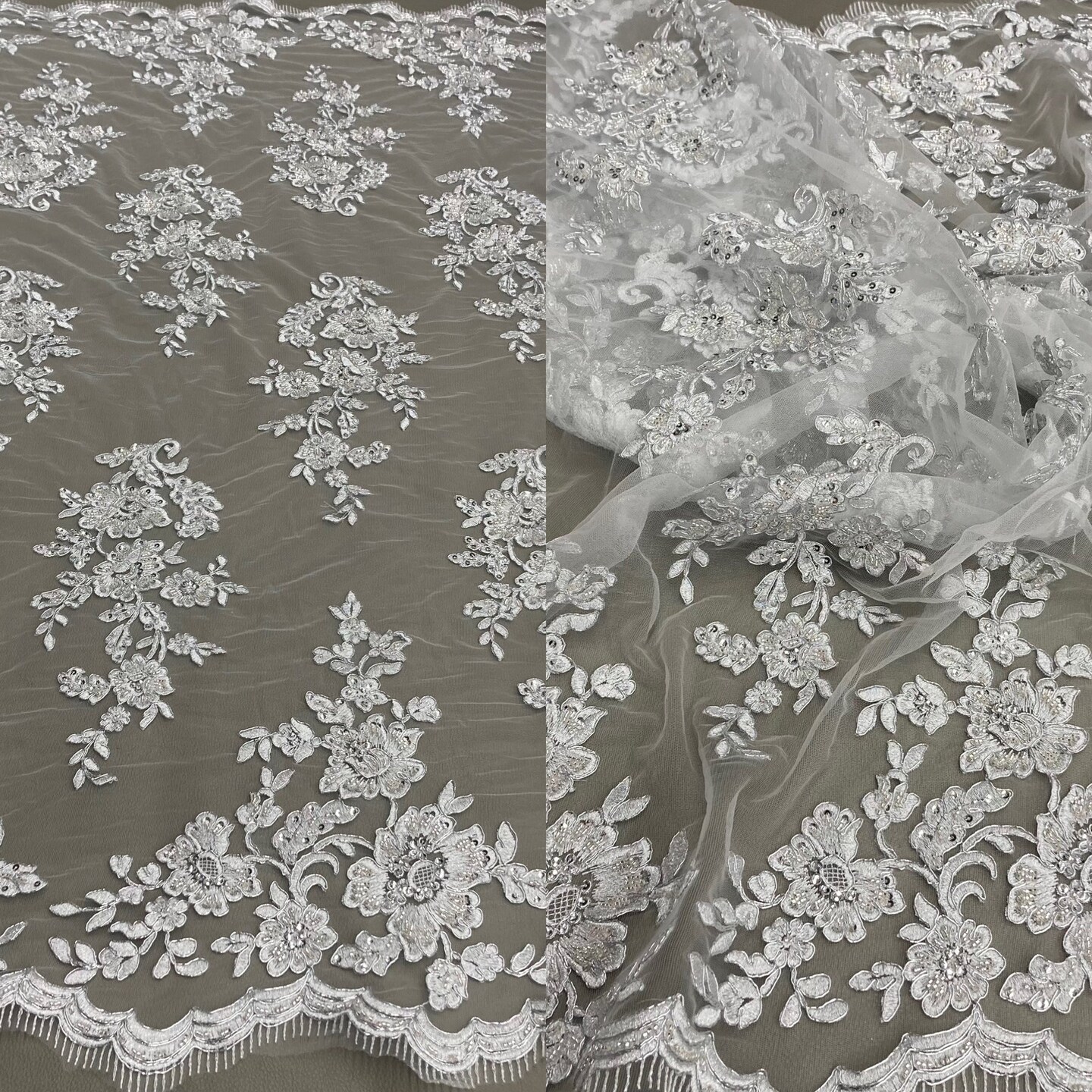 1 Yard Elegant Beaded Corded Bridal Lace Fabric Embroidered on Premium Mesh 51"