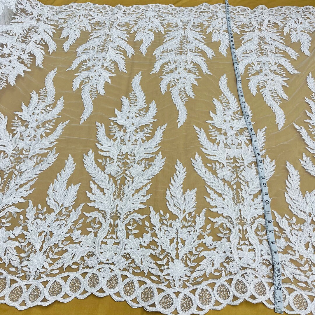1 Yard Elegant White Beaded & Corded Embroidered Lace Fabric, 51" Wide, Bridal Fabrication for Gowns & Décor