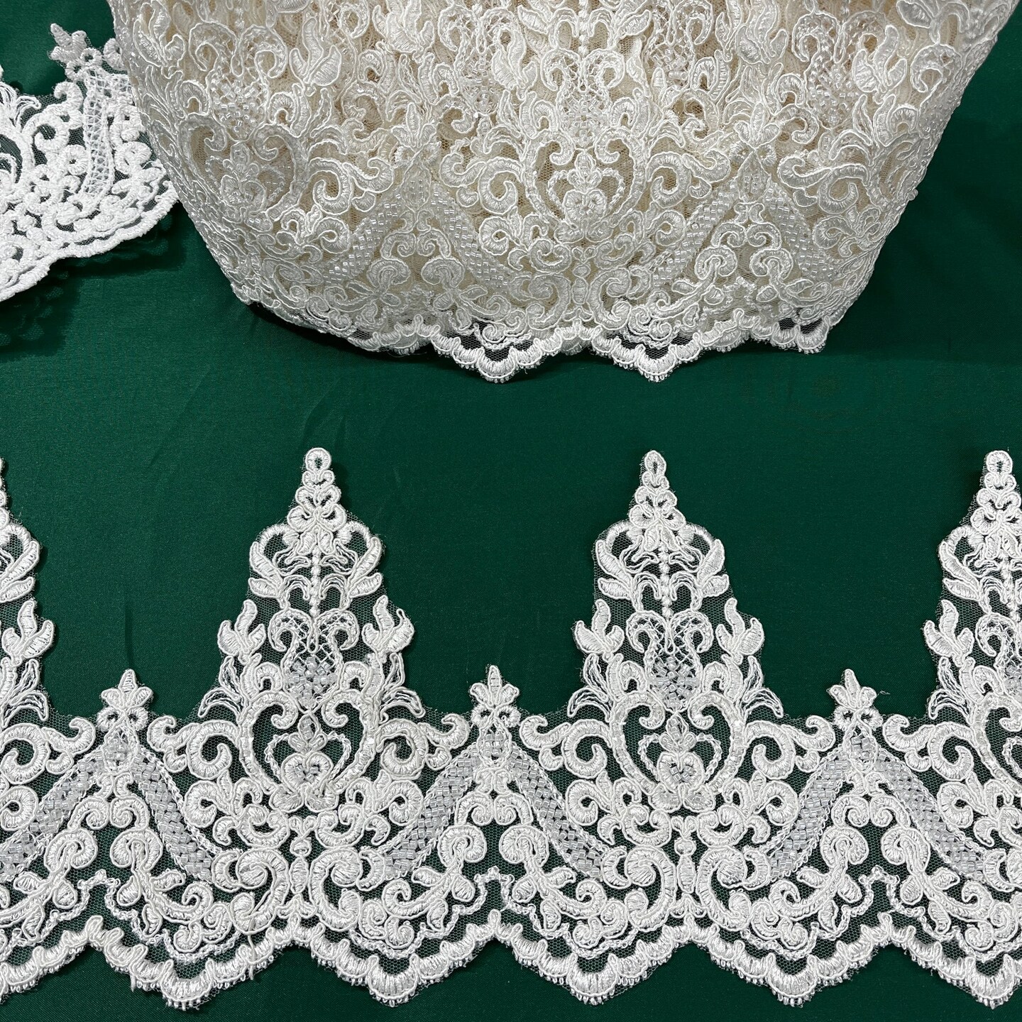 1 Yard Embroidered on 100% Polyester Organza 6″ Wide Beaded & Corded Lace Trimming