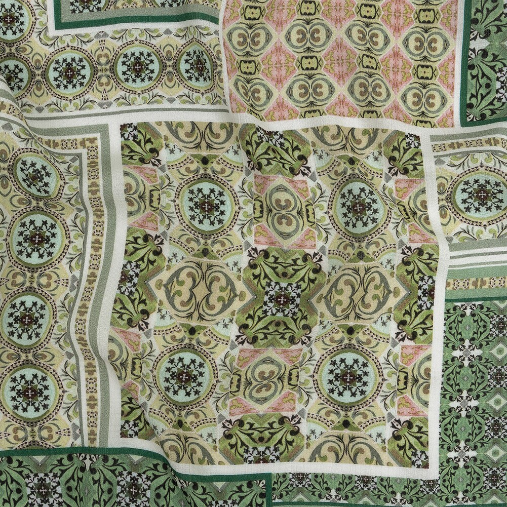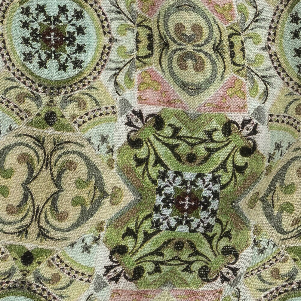 1 Yard Gauzy Wrinkled Rayon Woven Fabric Soft Green Ornate Patchwork Arabesco 53 inch Width