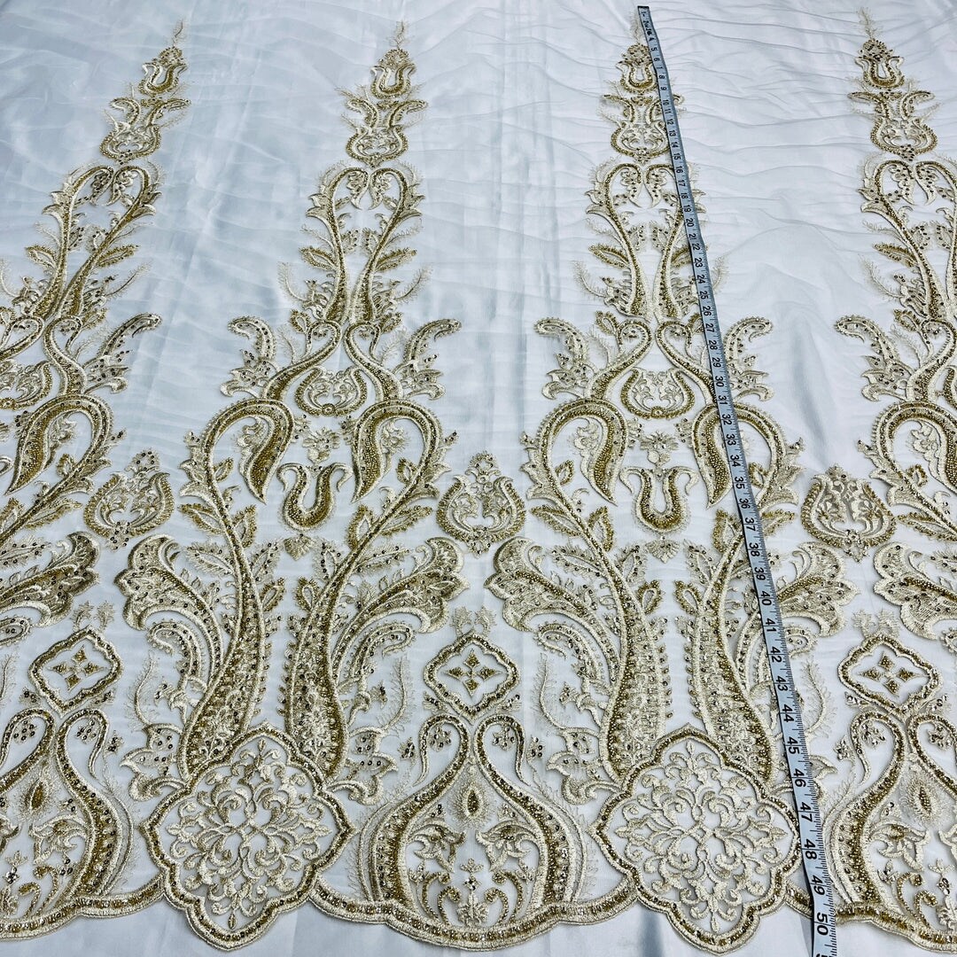 1 Yard Gold Beaded Lace Fabric Embroidered on Polyester Mesh, 50" Wide Decorative Fabrication
