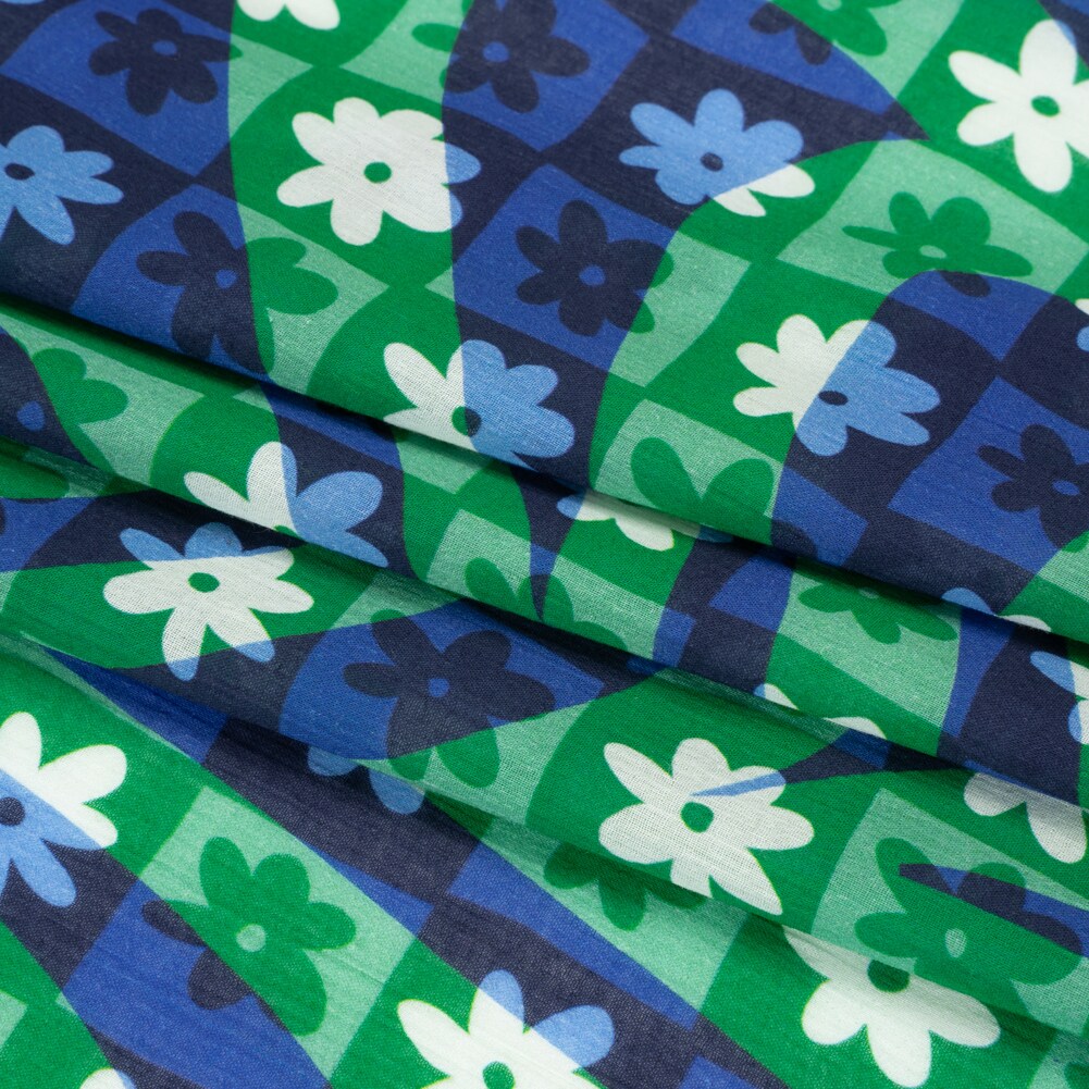 1 Yard Green and Blue Crinkled Cotton Gauzy Woven Floral Check Print Fabric