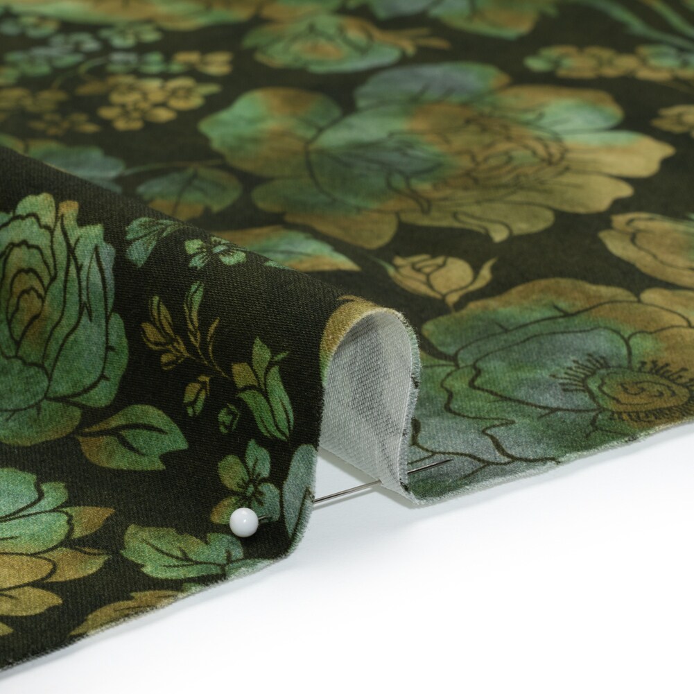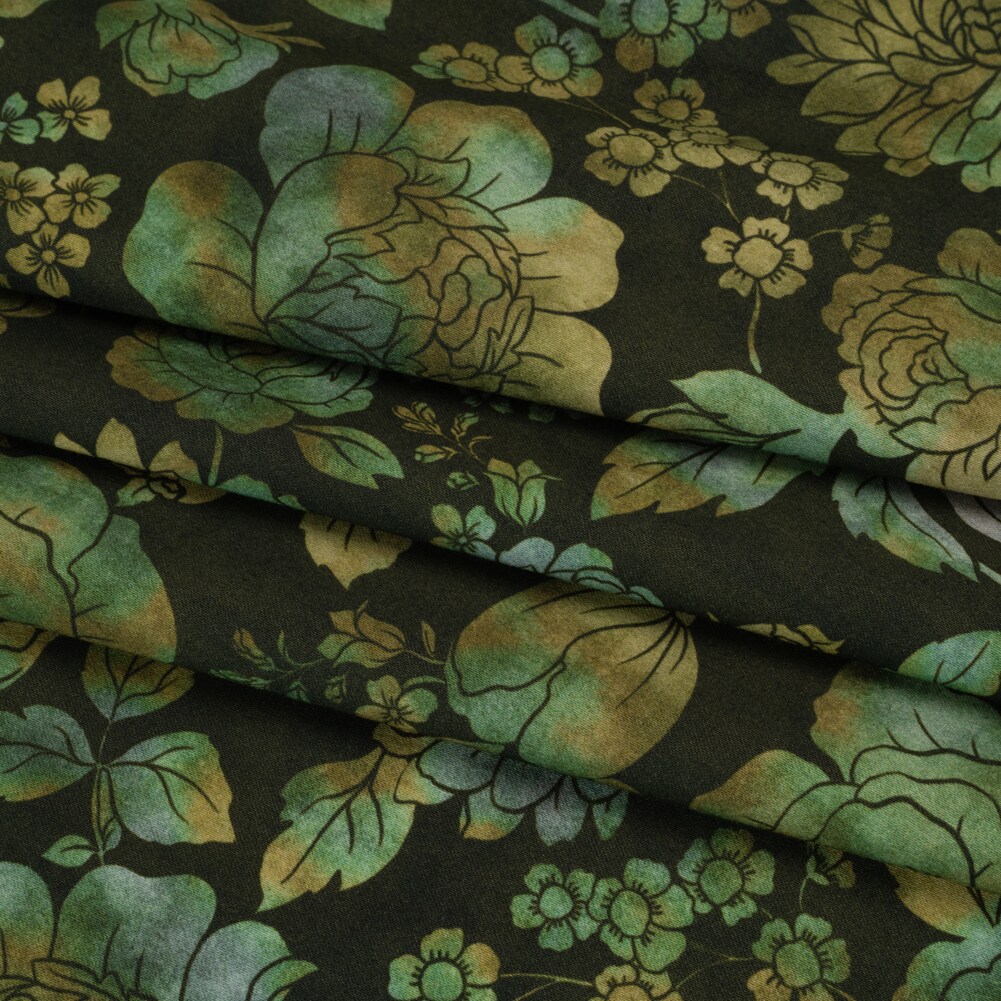 1 Yard Green Olive Navy Floral Cotton Sateen Stretch Fabric