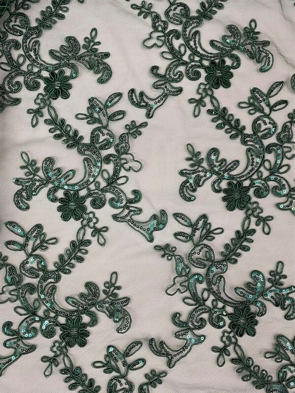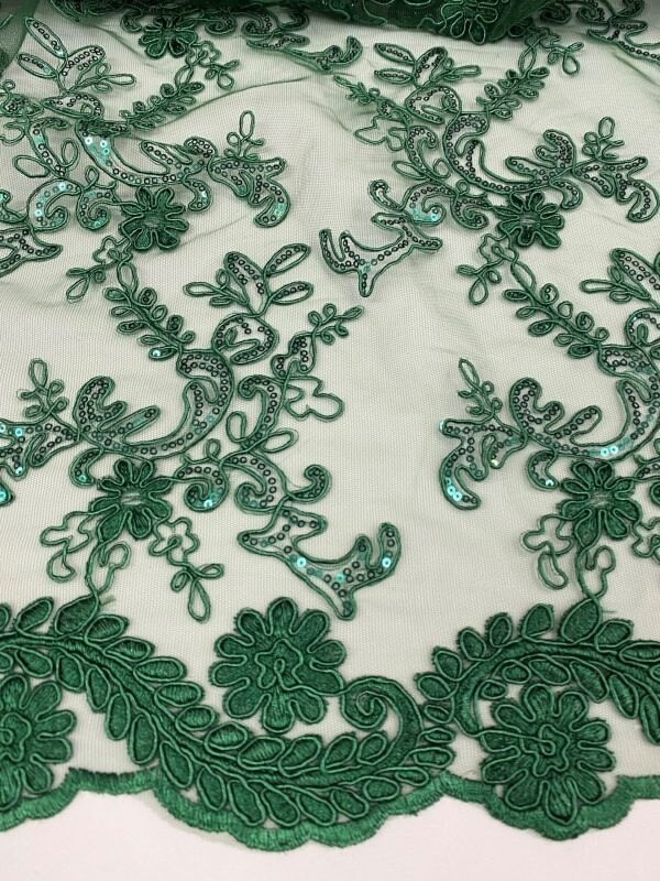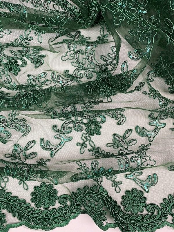 1 Yard Hunter Green Corded Sequin Lace Mesh Fabric with Double Scalloped Edge 54” Wide