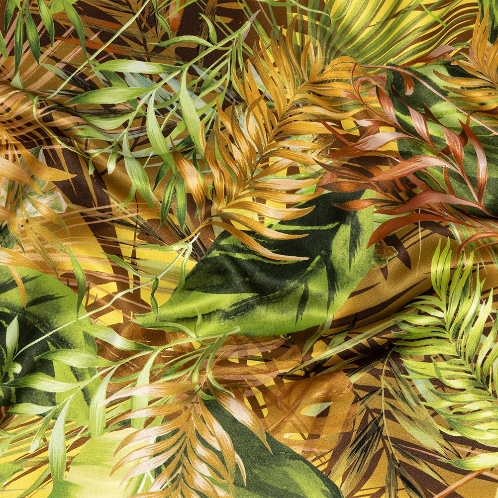 1 Yard Italian Green and Mustard Ferns and Foliage Digitally Printed Silk Charmeuse Fabric 53 inch Width