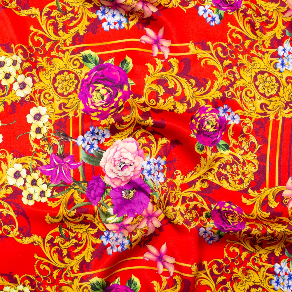 1 Yard Italian Red, Gold & Purple Ornate Floral Digitally Printed Silk Fabric Ideal for Formal gowns, 55 Inches Width