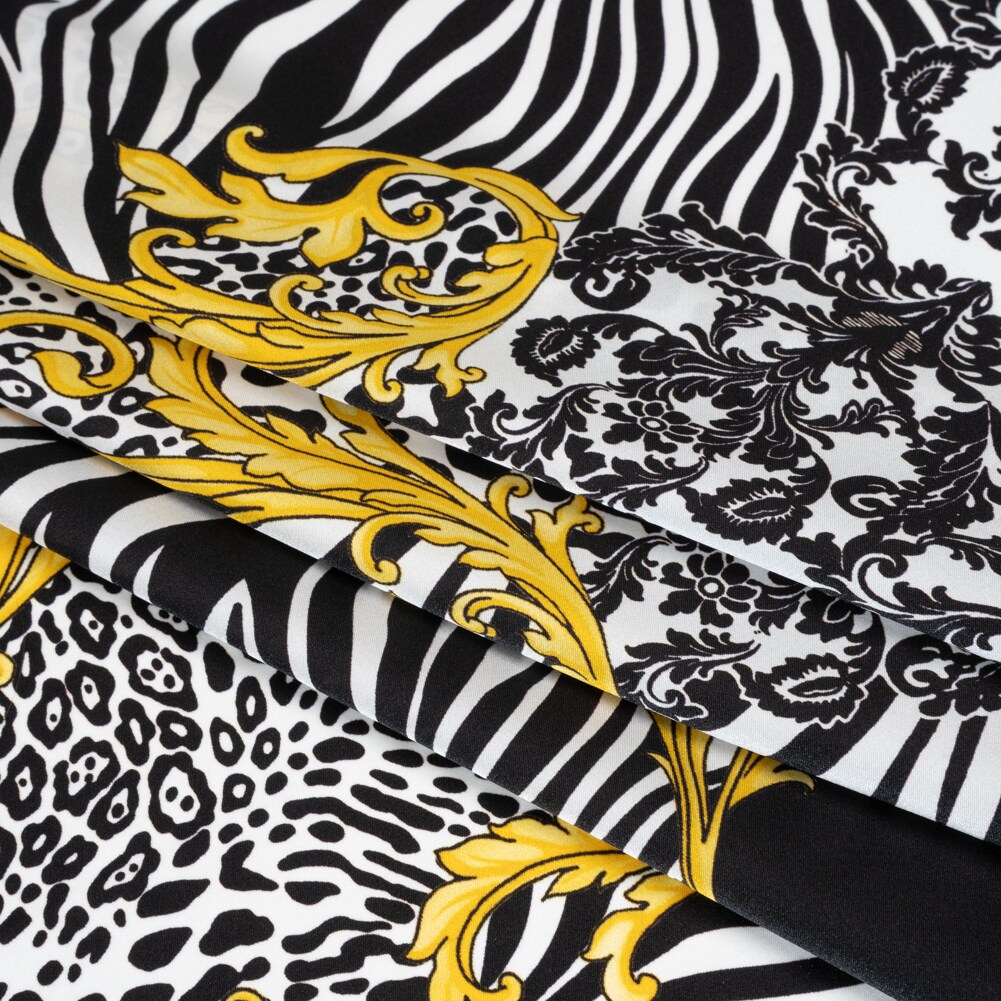 1 Yard Italian Silk Charmeuse Print Fabric Black, White & Yellow Gold Floral Scroll Patchwork with Greek Key Border, 53 Inch Width