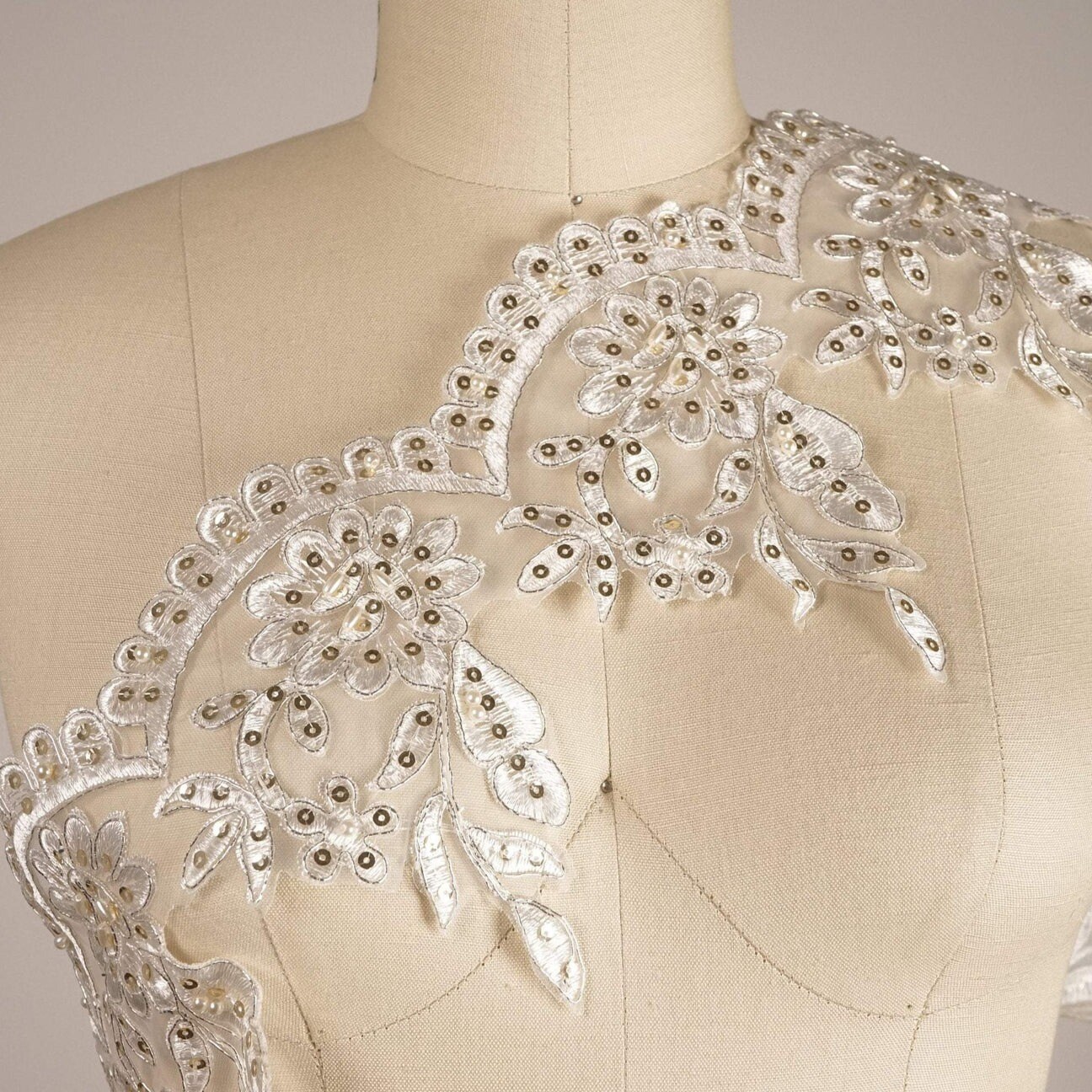 1 Yard Ivory and Gold Bridal Lace Trim with Beaded Roses and Scalloped Edges 6 Inch