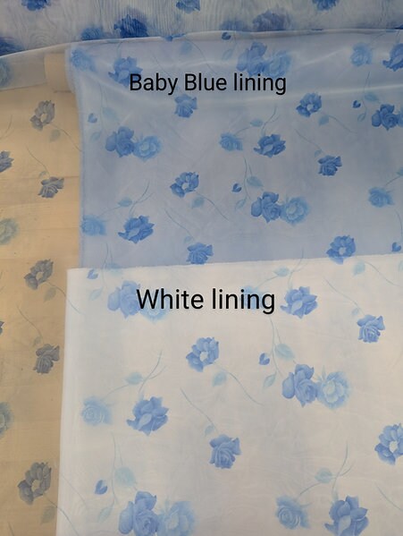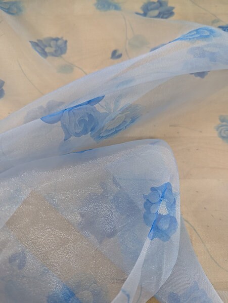 1 Yard Light Blue Organza Fabric with Dark Blue Flowers Sheer Lightweight Polyester 58/59 inches wide