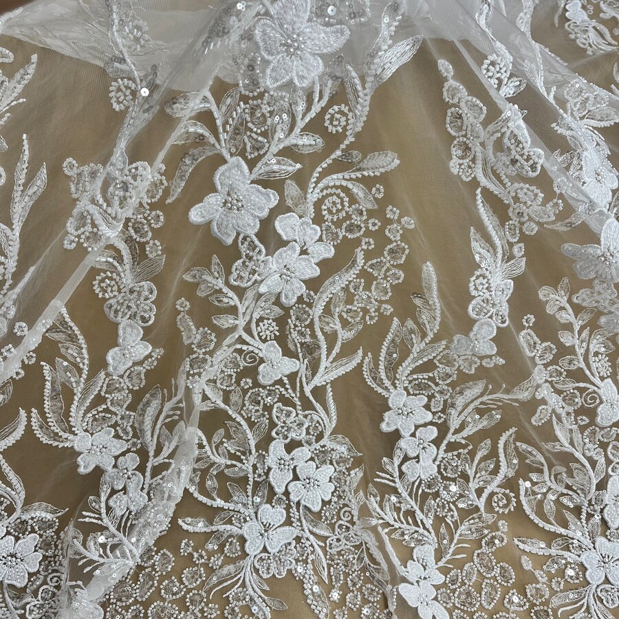 1 Yard Luxurious Beaded Lace Fabric Embroidered on Polyester Net Mesh