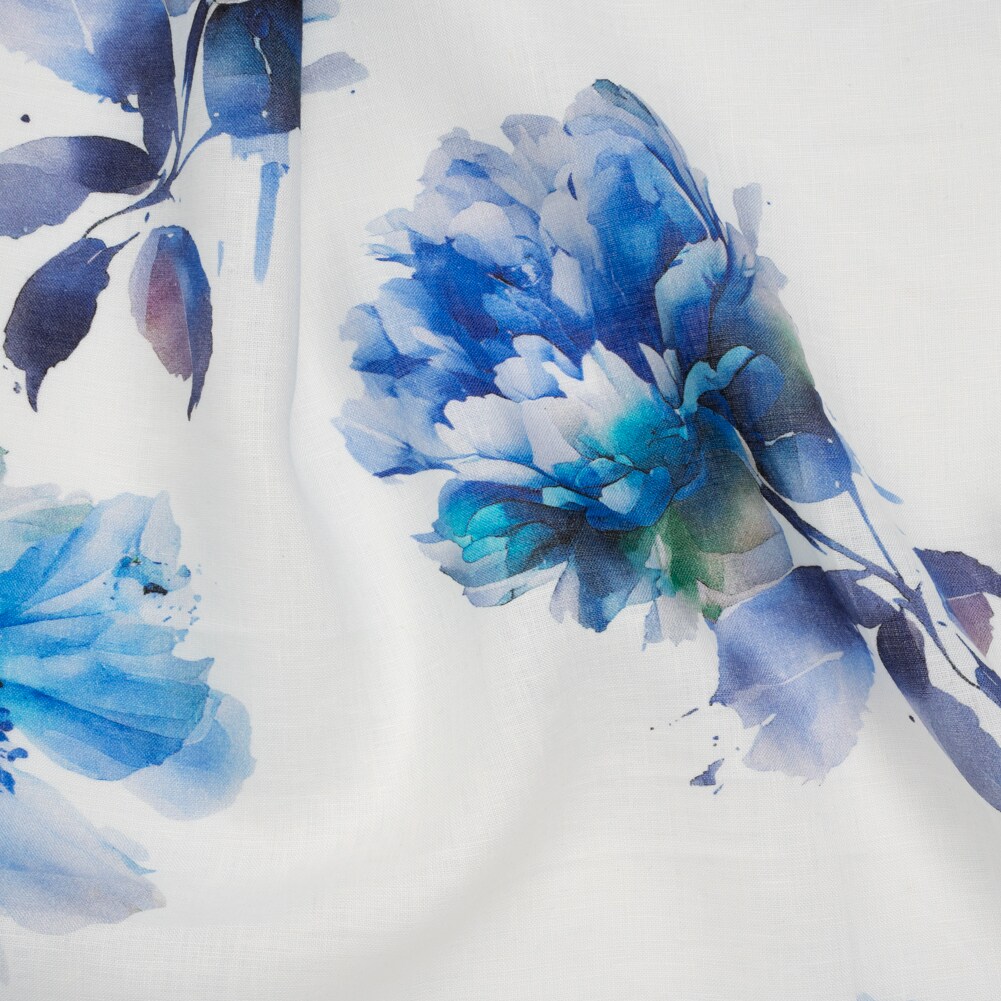 1 Yard Medium Weight Linen Fabric Wisteria Blue White Wild Roses Floral 58 inch Width