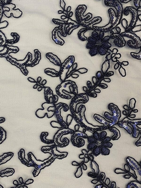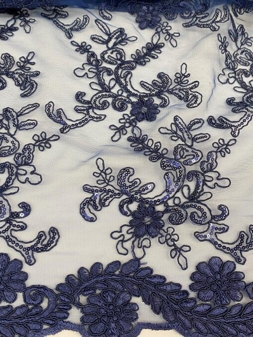 1 Yard Navy Blue Corded Sequin Lace Mesh Fabric with Double Scalloped Edge 54” Wide