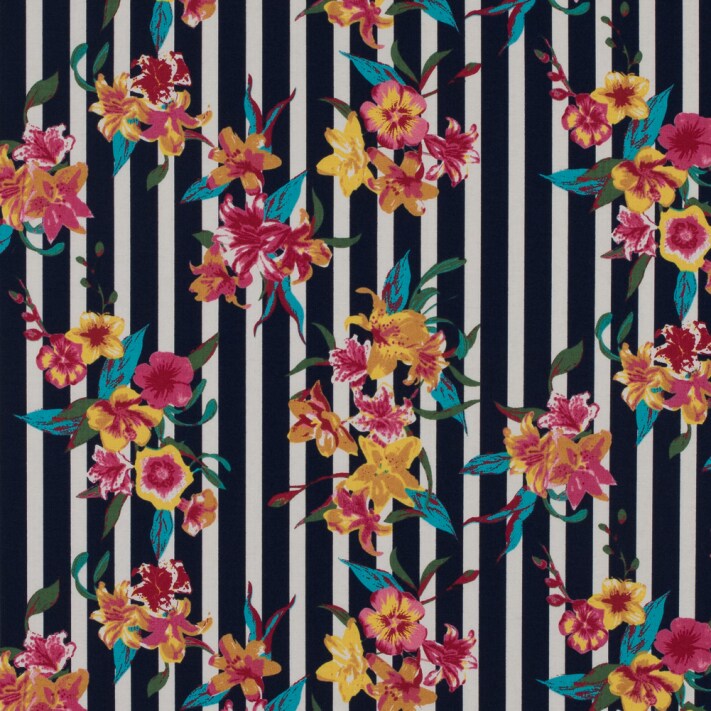 1 Yard Navy Multicolored Striped Floral Cotton Poplin Fabric