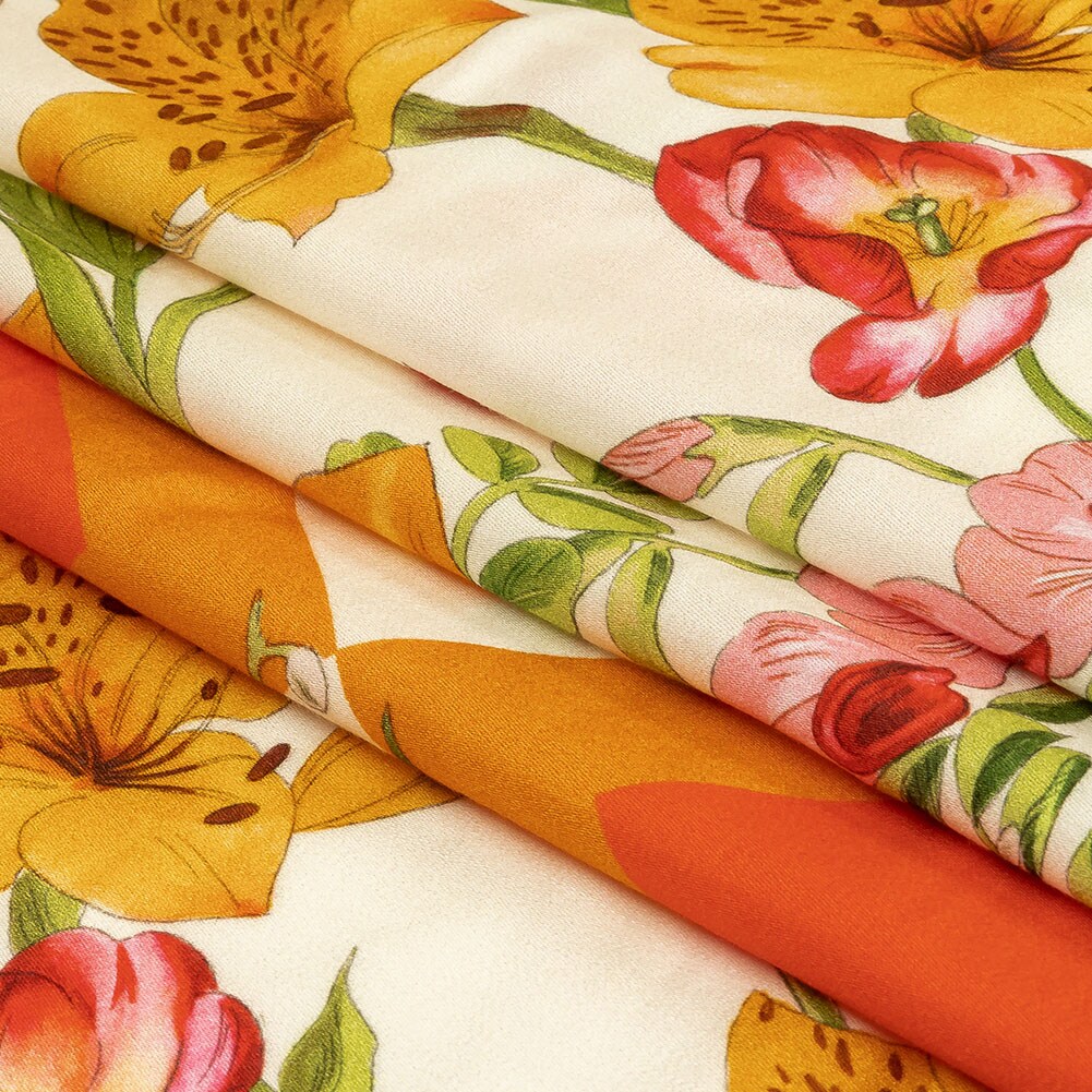 1 Yard Orange Pink Floral Rayon Challis Golden Garden Print Fabric 55 inch Width