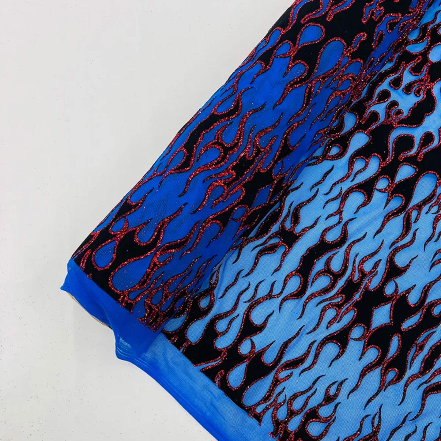 1 Yard Power Mesh Fabric with Black Flocked Flame and Red Glitter Design 60 Inch Width