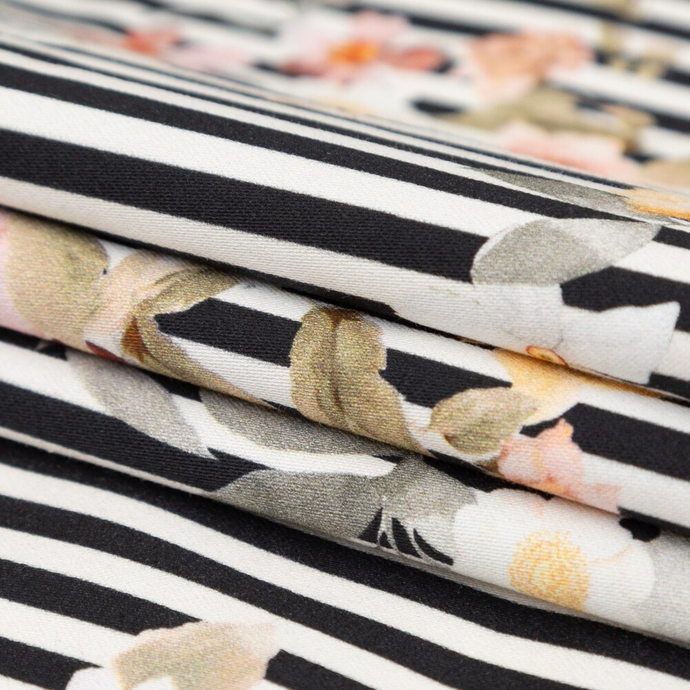 1 Yard Red and Black Floral and Stripes Stream of Consciousness Print Stretch Cotton Sateen Fabric