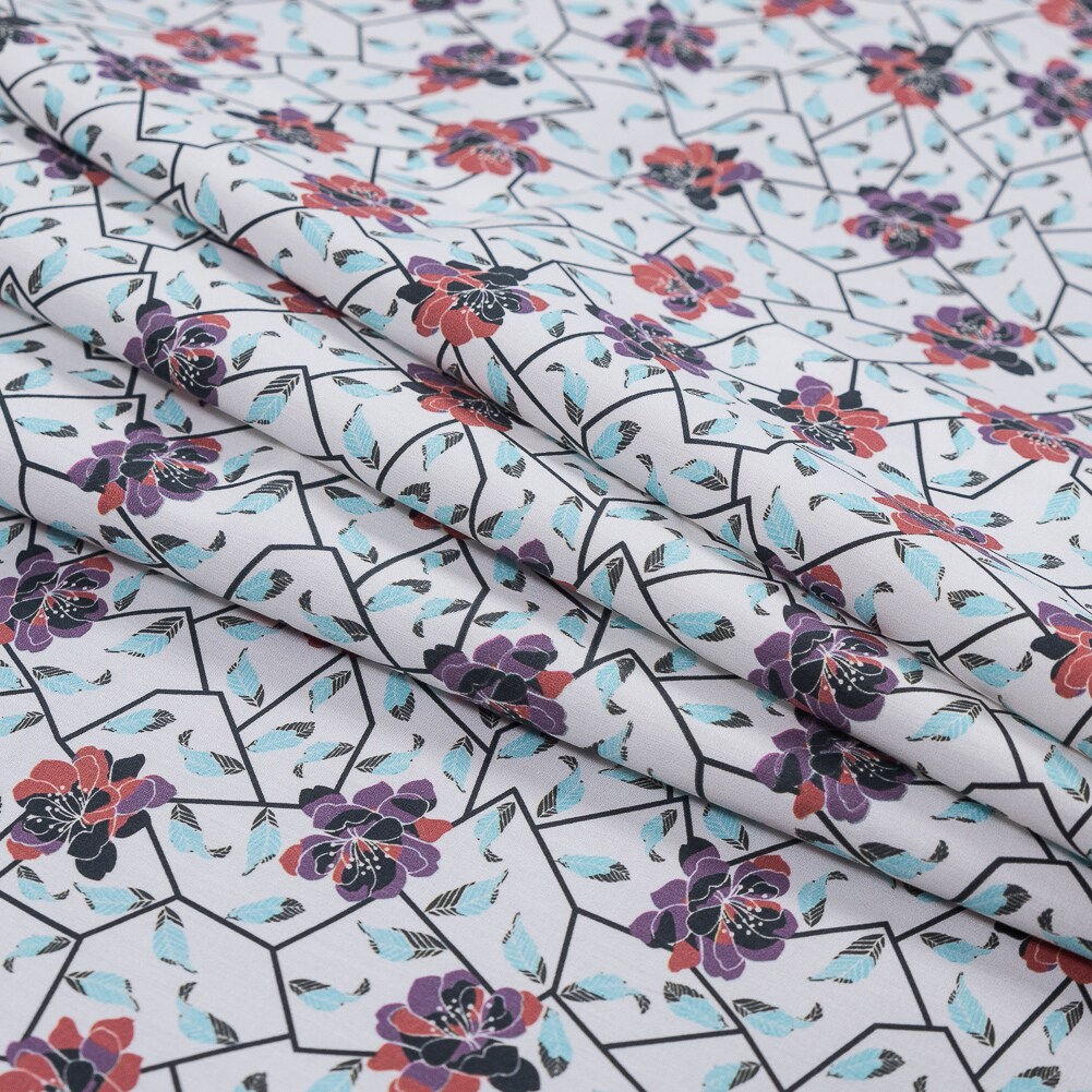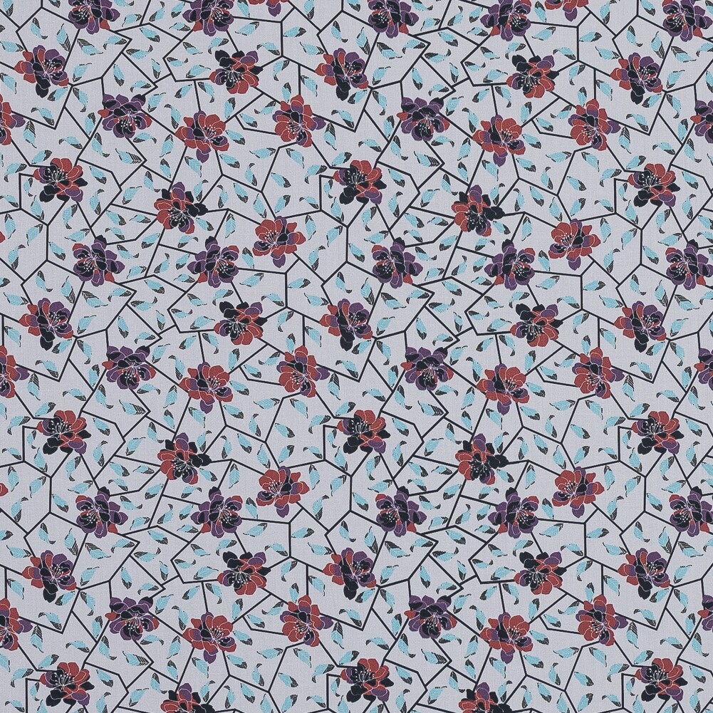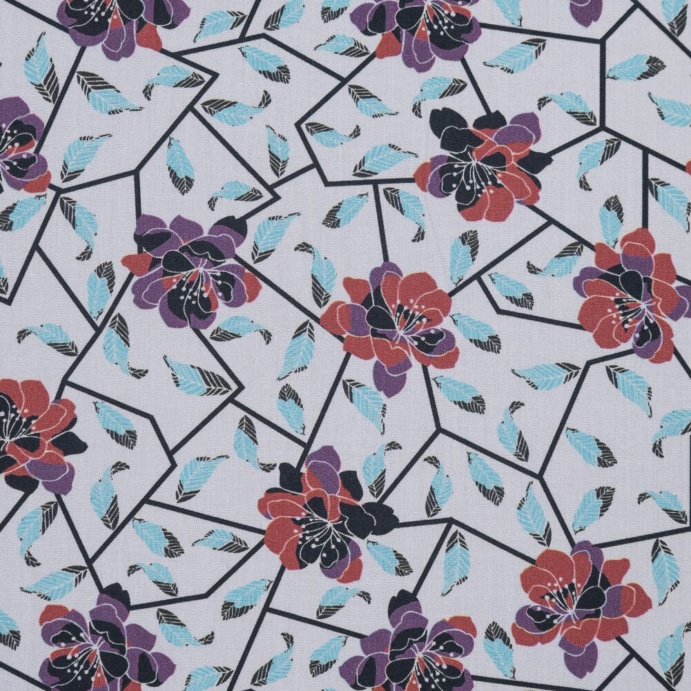 1 Yard Red and Blue Cotton Poplin Fabric with Floral Feather Print