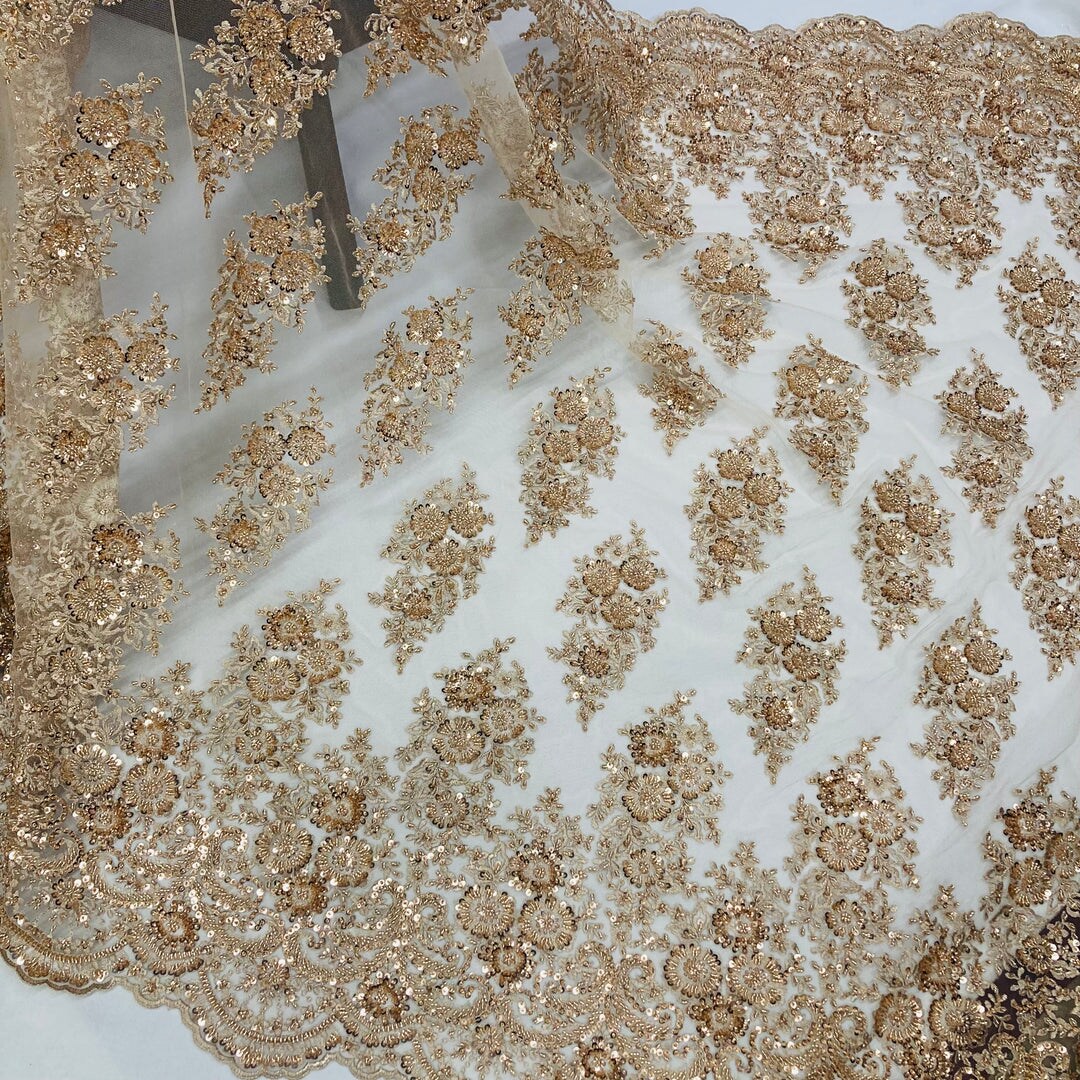 1 Yard Red Beaded Embroidered Lace Fabric on 100% Polyester Mesh, 50" Width