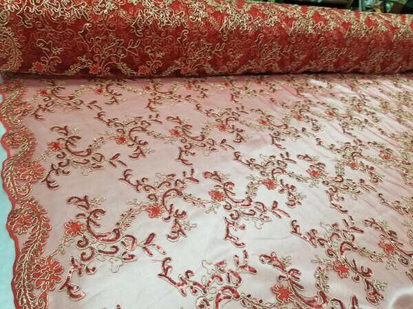 1 Yard Red Metallic Flowers Sequins Mesh Lace Fabric for Tablecloths and Costumes