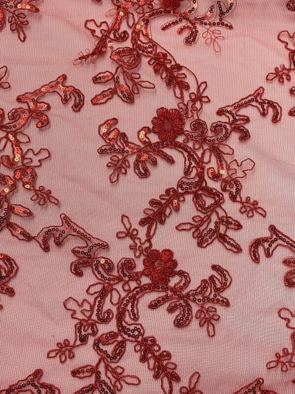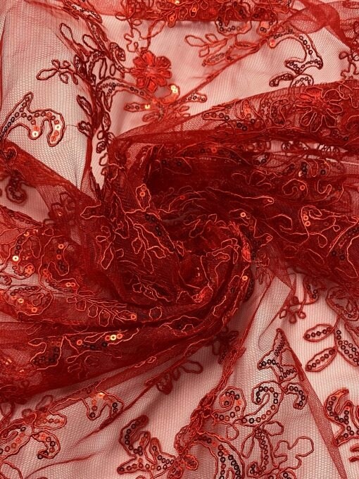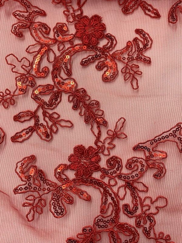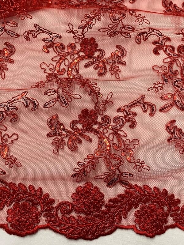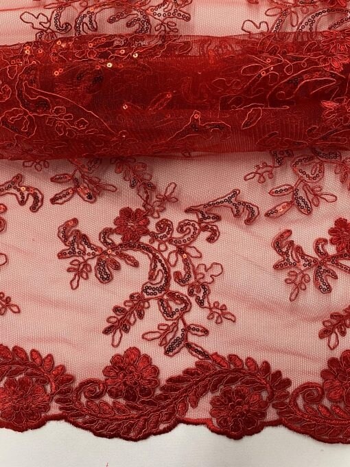 1 Yard Red Sequin Lace Fabric Corded Embroidered Mesh with Double Scallop Edge 54" Wide