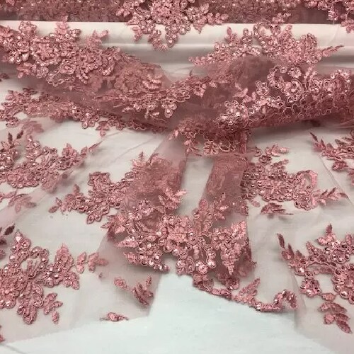 1 Yard Rose Gold Sequin Lace Fabric Embroidered Mesh Polyester Blend for Evening Gowns Bridal