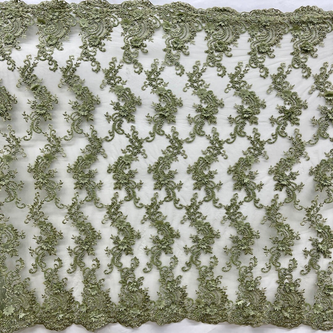 1 Yard Sage 3D Beaded Floral Embroidered Lace Fabric on Polyester Mesh, 52” Wide