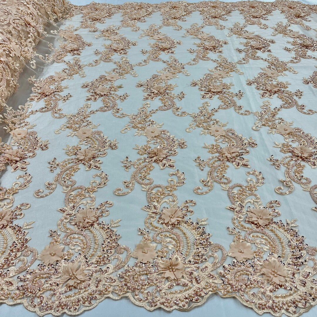 1 Yard Sage 3D Beaded Floral Embroidered Lace Fabric on Polyester Mesh, 52” Wide