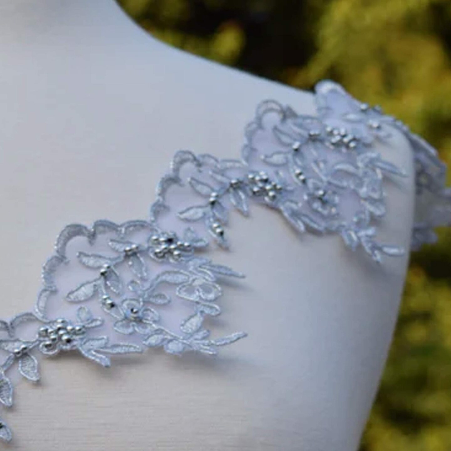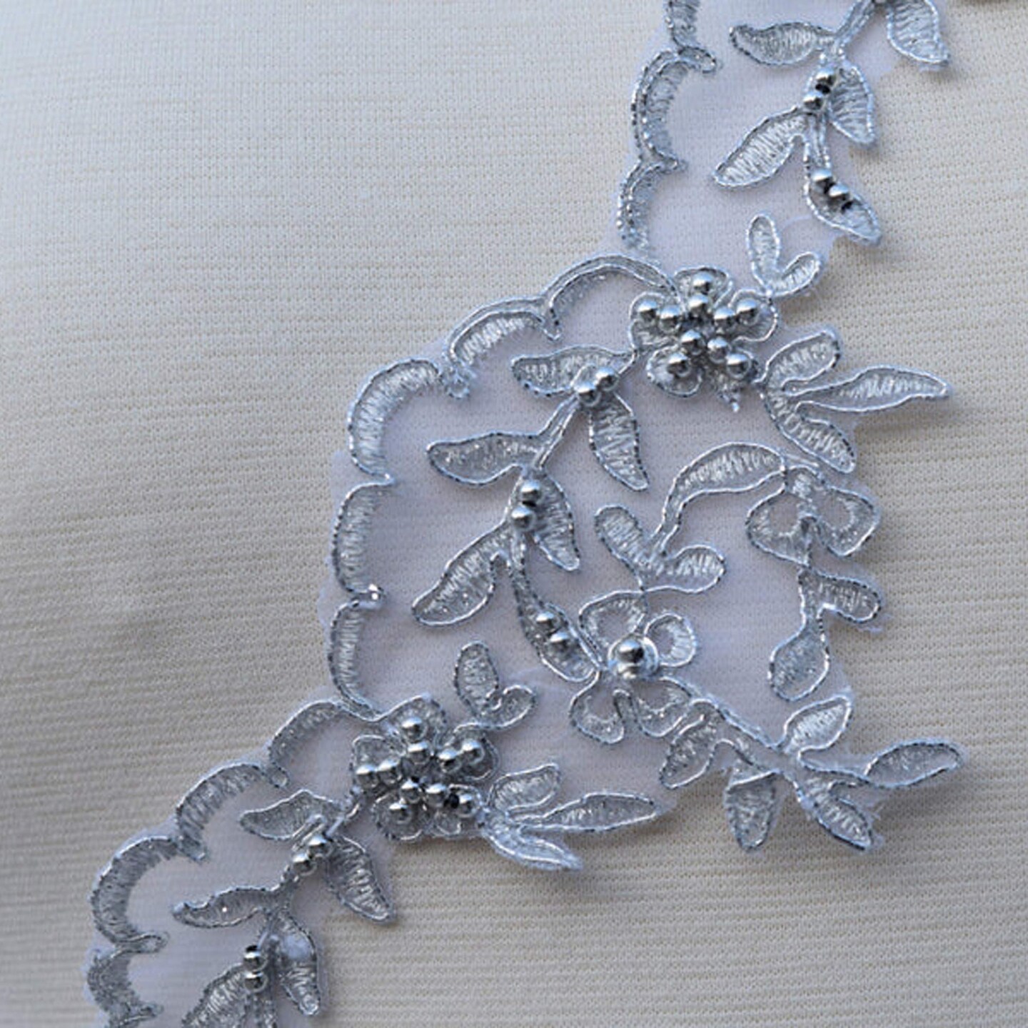 1 Yard Shimmery Silver Polyester Lace Trim with Silver Beaded Embellishments 3 Inch Width