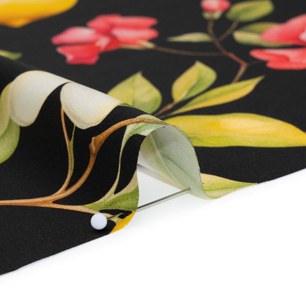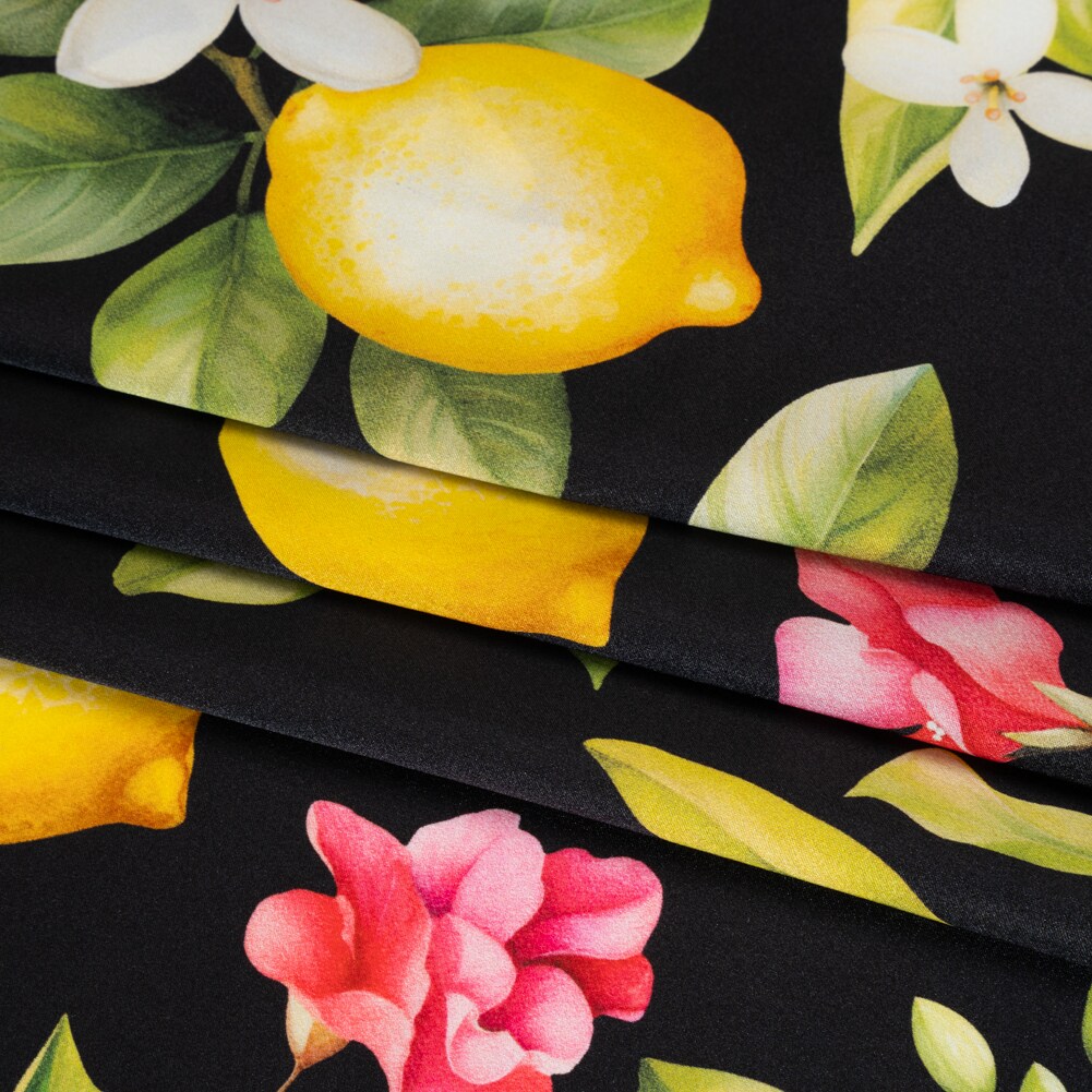 1 Yard Silk Charmeuse Print Black, Green & Yellow Lemon Tree 53" Wide Luxury Fabric for Dresses & Skirts