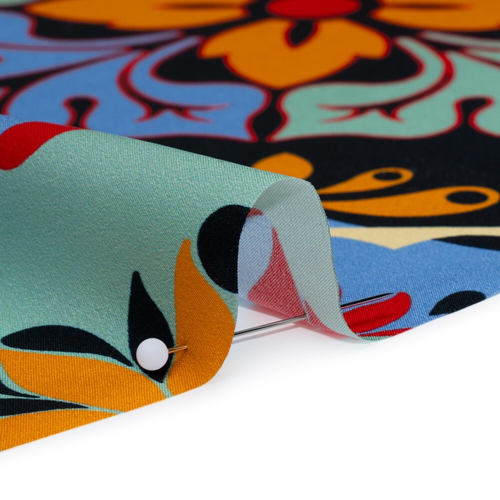 1 Yard Silk Charmeuse Print Fabric with Midnight Navy Mint and Country Blue Fancy Floral Tiles 53 Inch Width