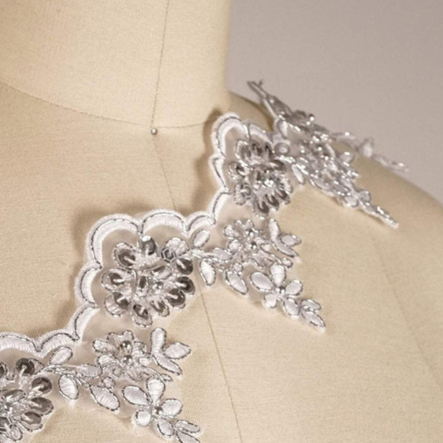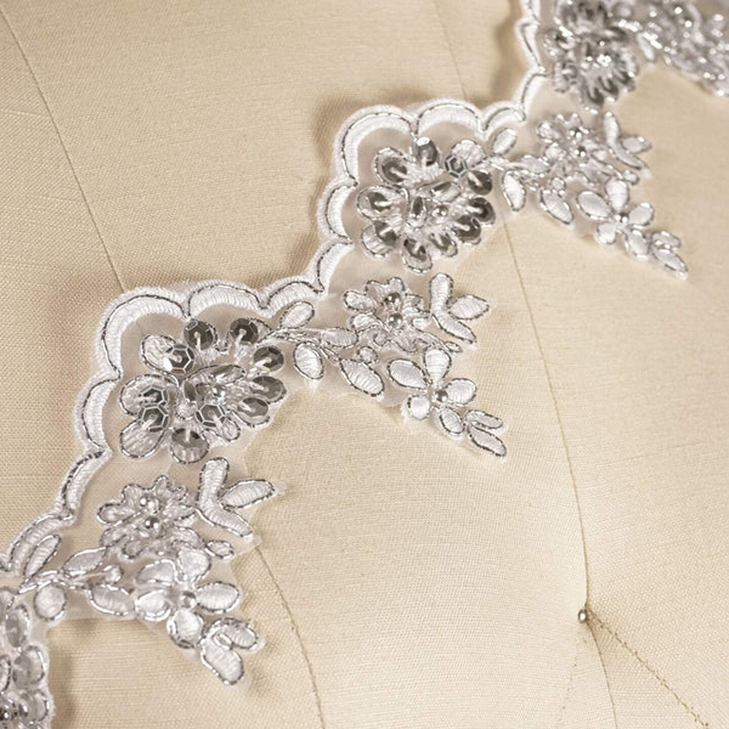 1 Yard Silver Sequined Scalloped Bridal Lace Trim with Leaf Motif