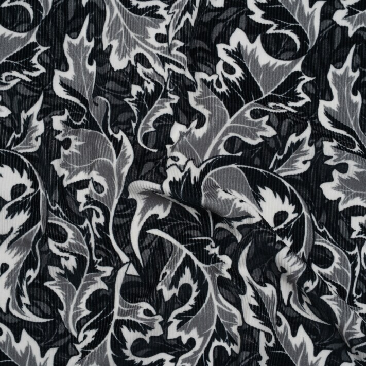 1 Yard Soft Cotton Corduroy Fabric Black White Gray Oak Leaves Print