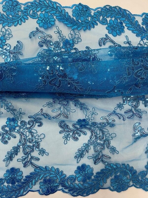 1 Yard Turquoise Sequin Embroidered Lace Fabric Corded Mesh Double Scallop Edge 54" Wide
