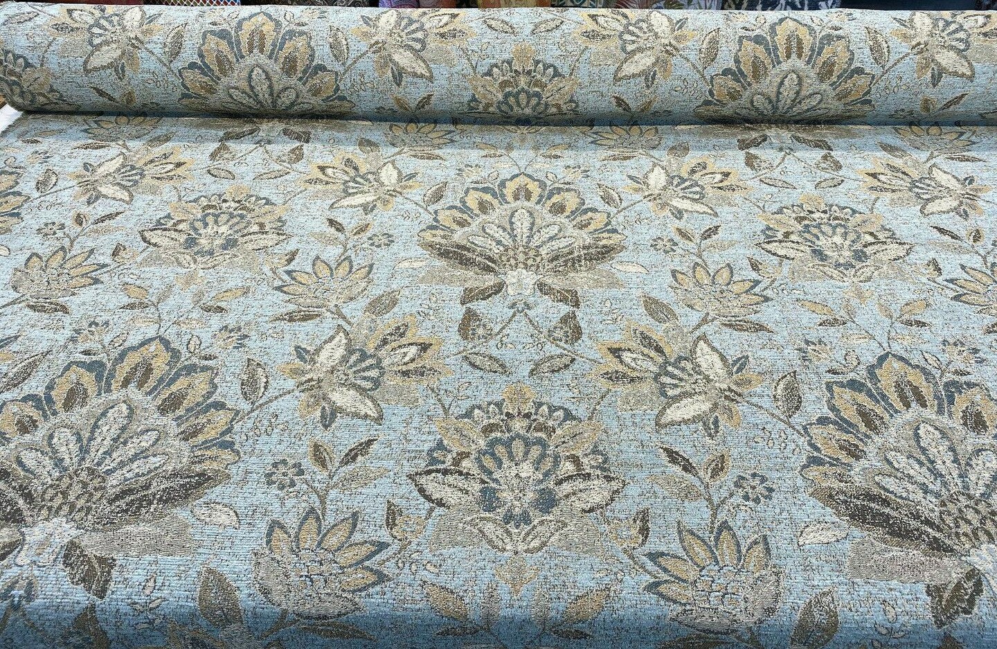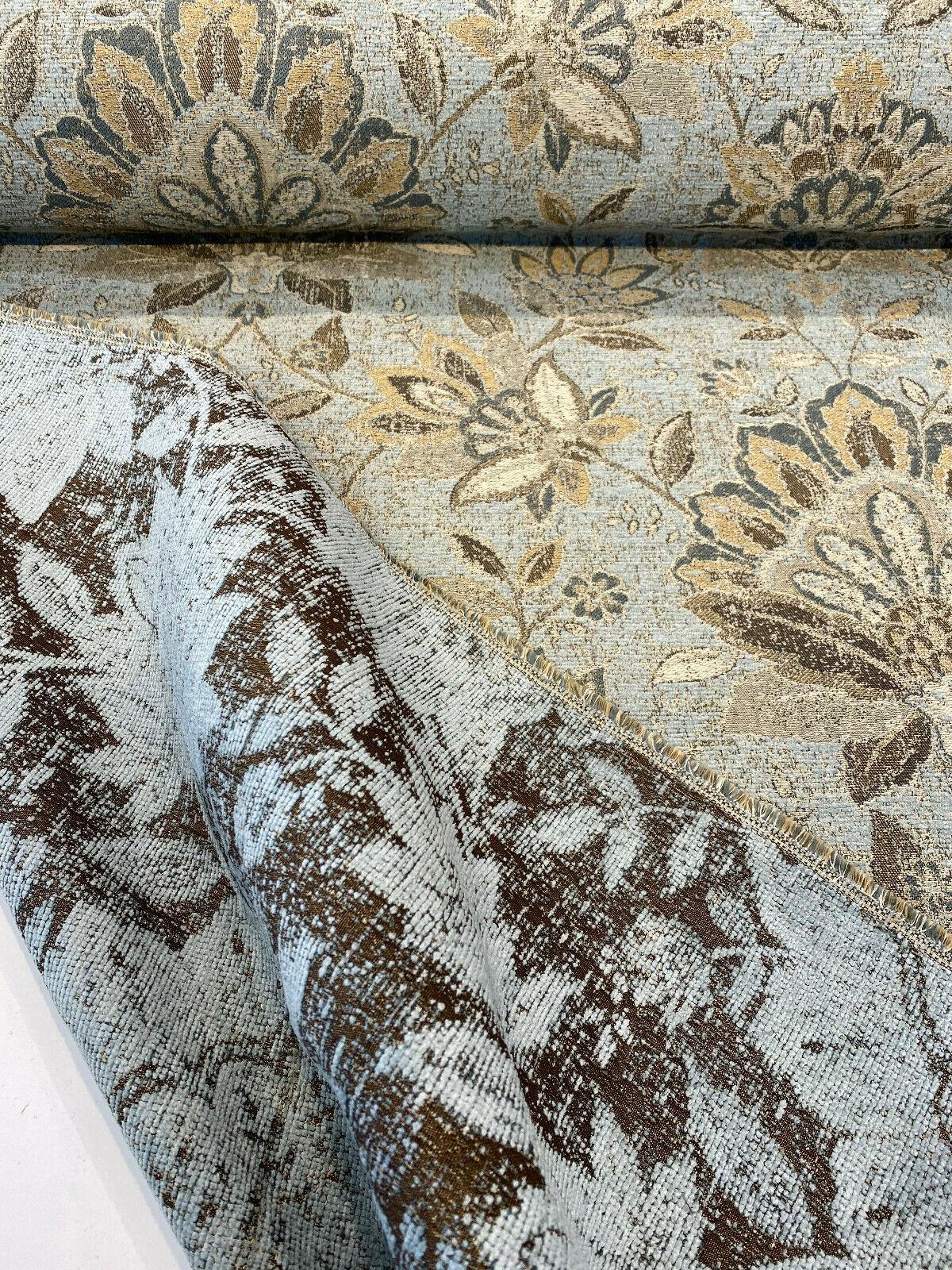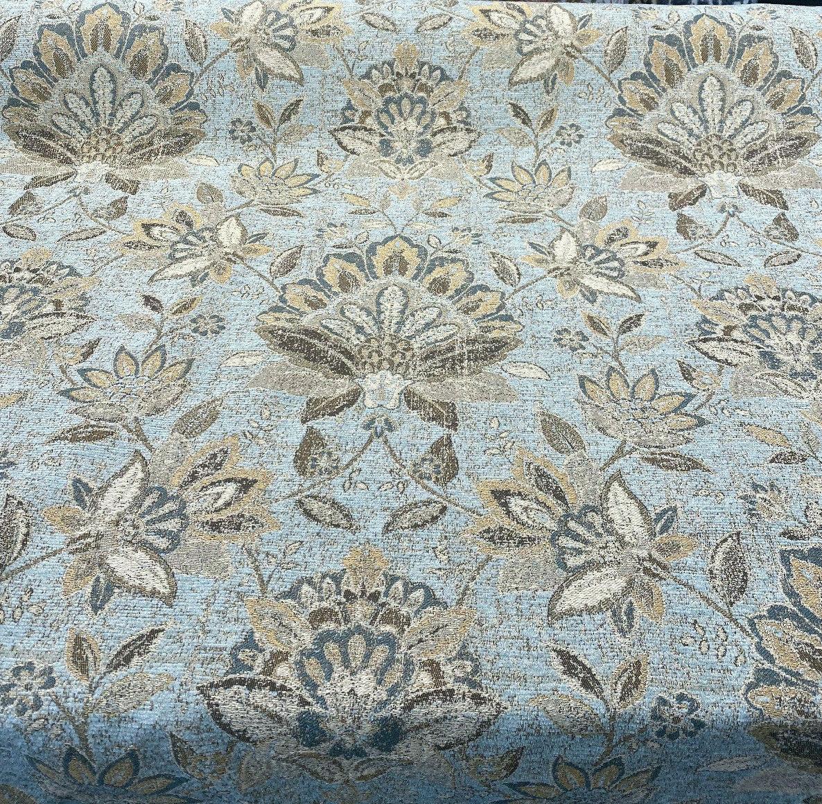 1 Yard Vintage Damask 100% Polyester Chenille Upholstery Fabric in Teal Blue Gold and Rust 57 inch Width