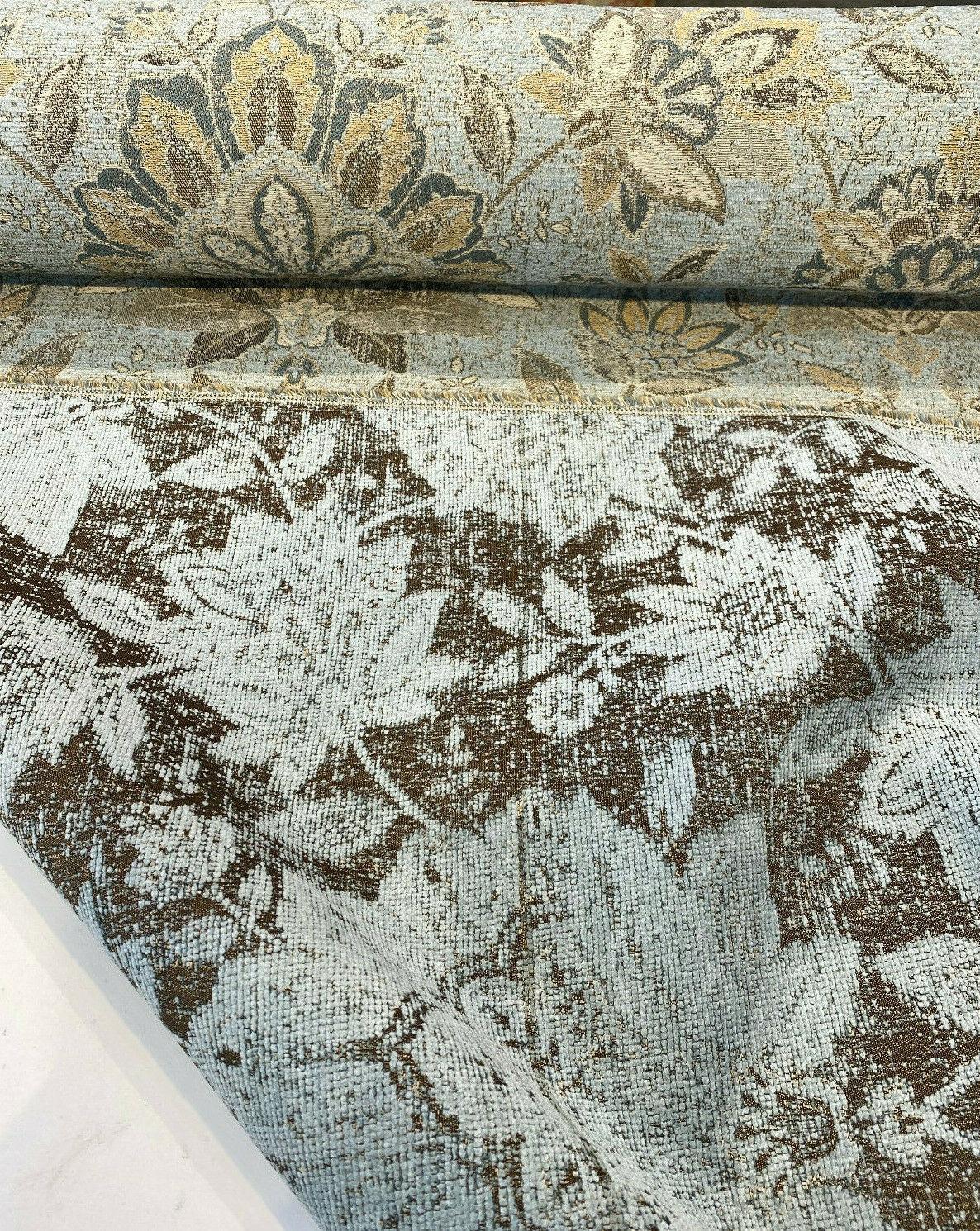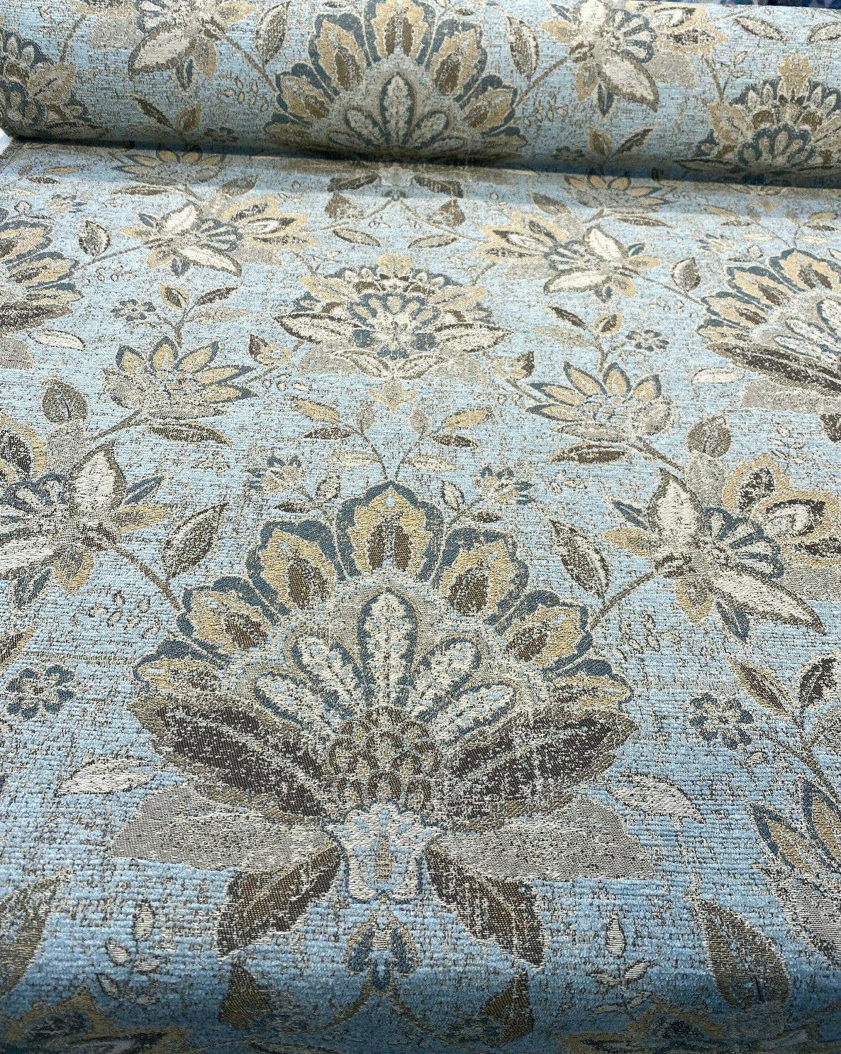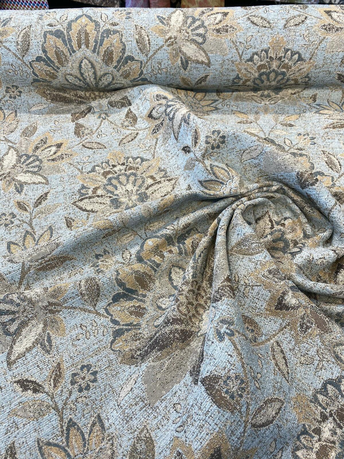 1 Yard Vintage Damask 100% Polyester Chenille Upholstery Fabric in Teal Blue Gold and Rust 57 inch Width