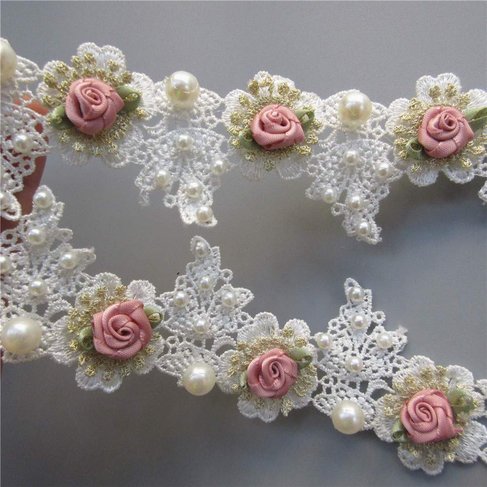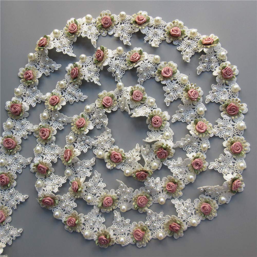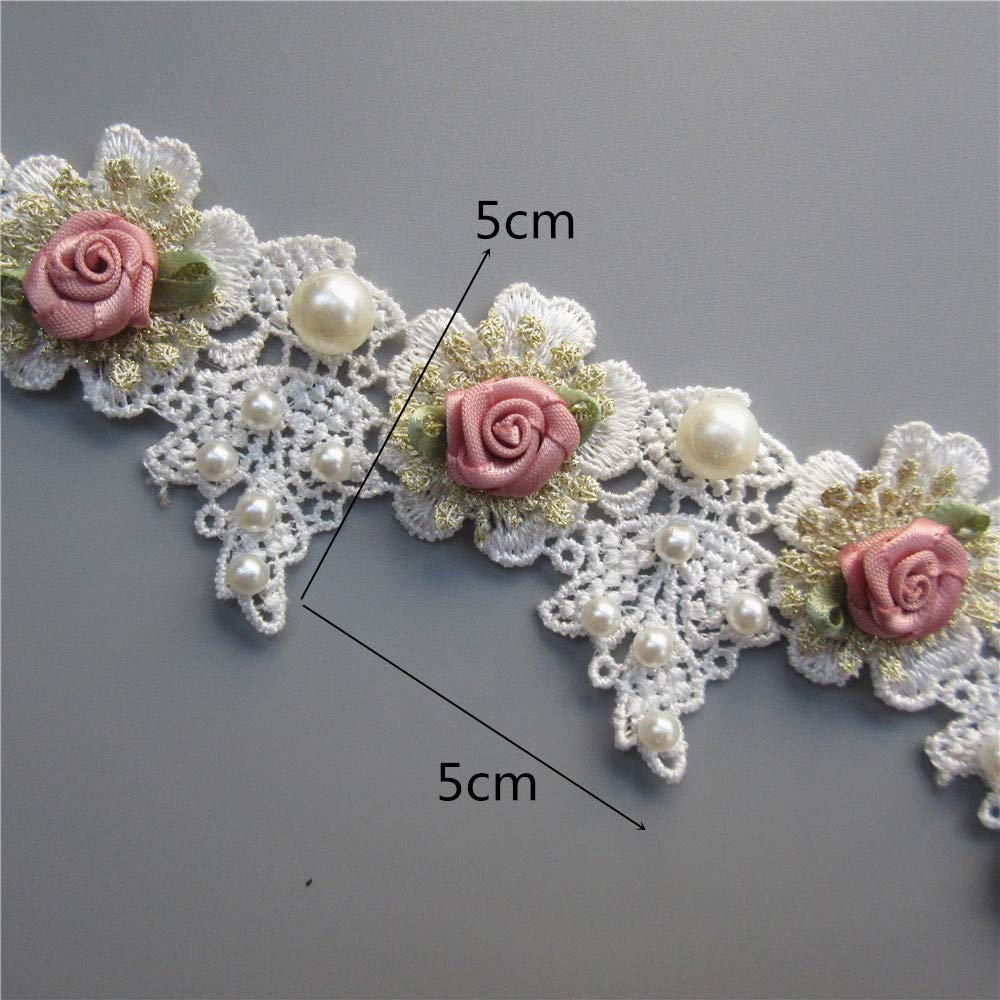 1 Yard Vintage Gold Pearl Rose Flowers Embroidered Lace Trim Fabric Floral Appliques Lace Ribbon Bridal Ornaments Handmade DIY Sewing Supplies Craft for Costume Hat Decoration 1.96" Wide