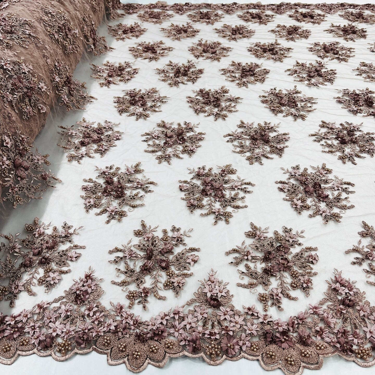 1 Yard Whimsical Pink Beaded 3D Floral Lace Fabric on Net Mesh 50 inch Width