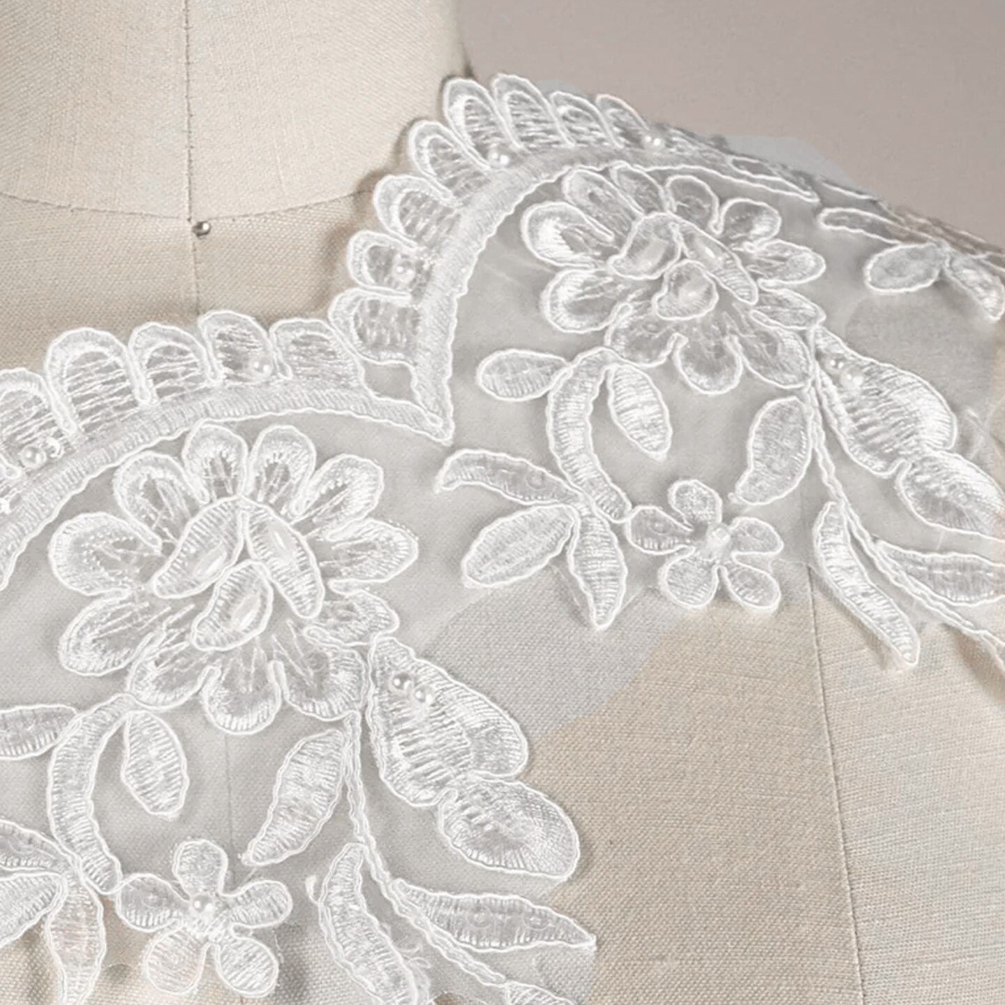 1 Yard White Bridal Lace Trim with Beaded Rose Design and Scalloped Edges 6 Inch