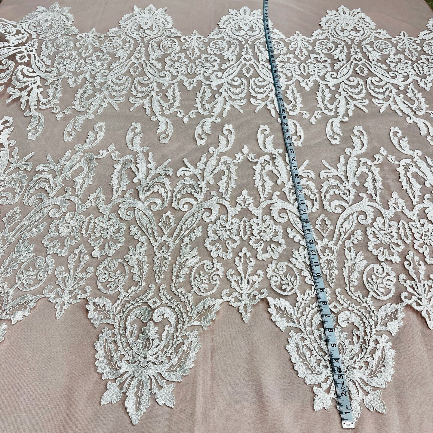 1 Yard White Corded Bridal Lace Fabric Embroidered on Polyester Net Mesh 52 inch Width