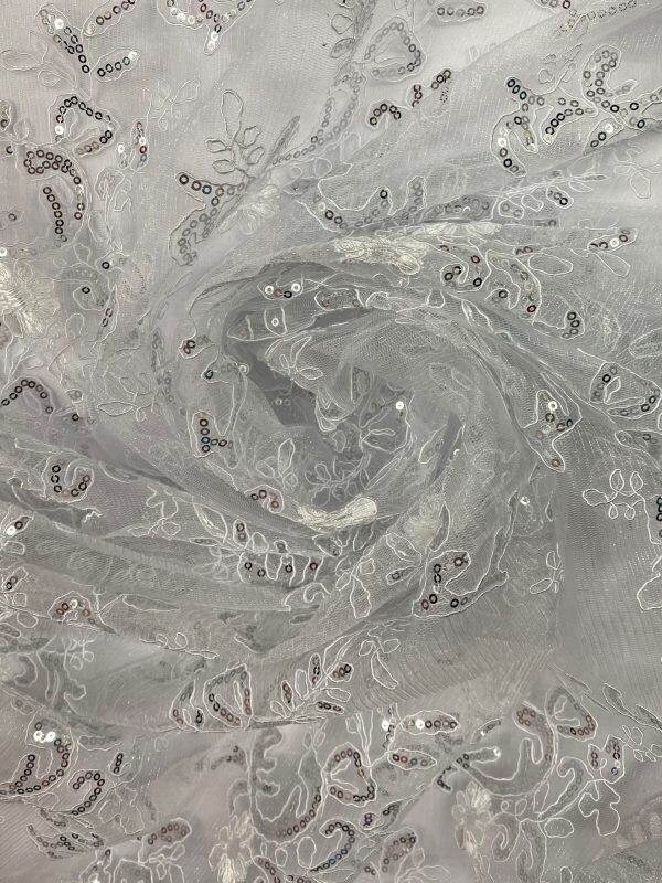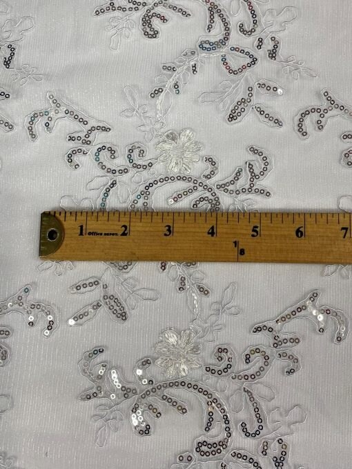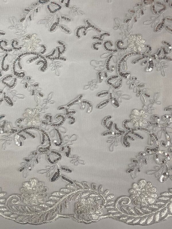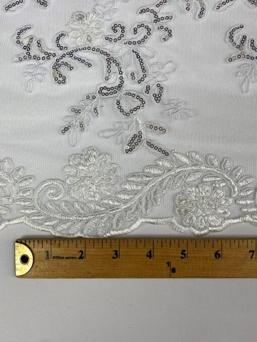 1 Yard White/Silver Sequin Lace Fabric, Corded Mesh Embroidered with Double Scalloped Edges 54″ Wide