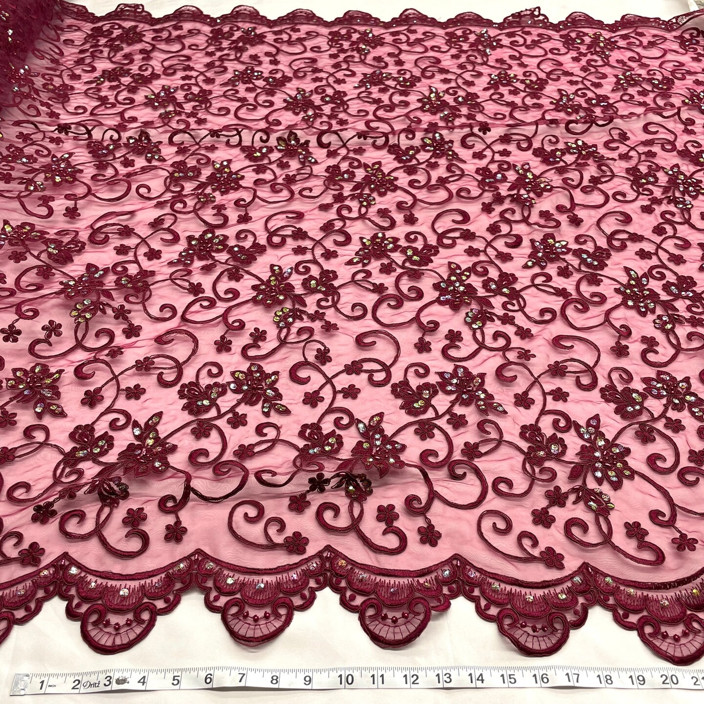 1 Yard Wine Beaded & Corded Bridal Lace Fabric Embroidered on Polyester Organza 54 Inch Width
