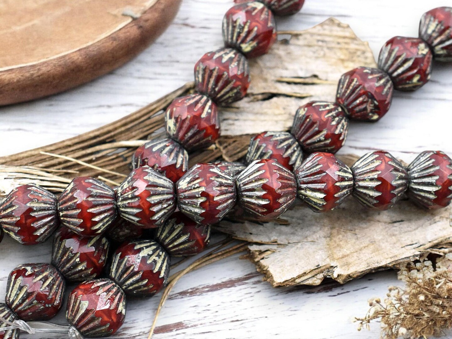 *10* 10mm Red Silk Picasso Fluted Bicone Beads