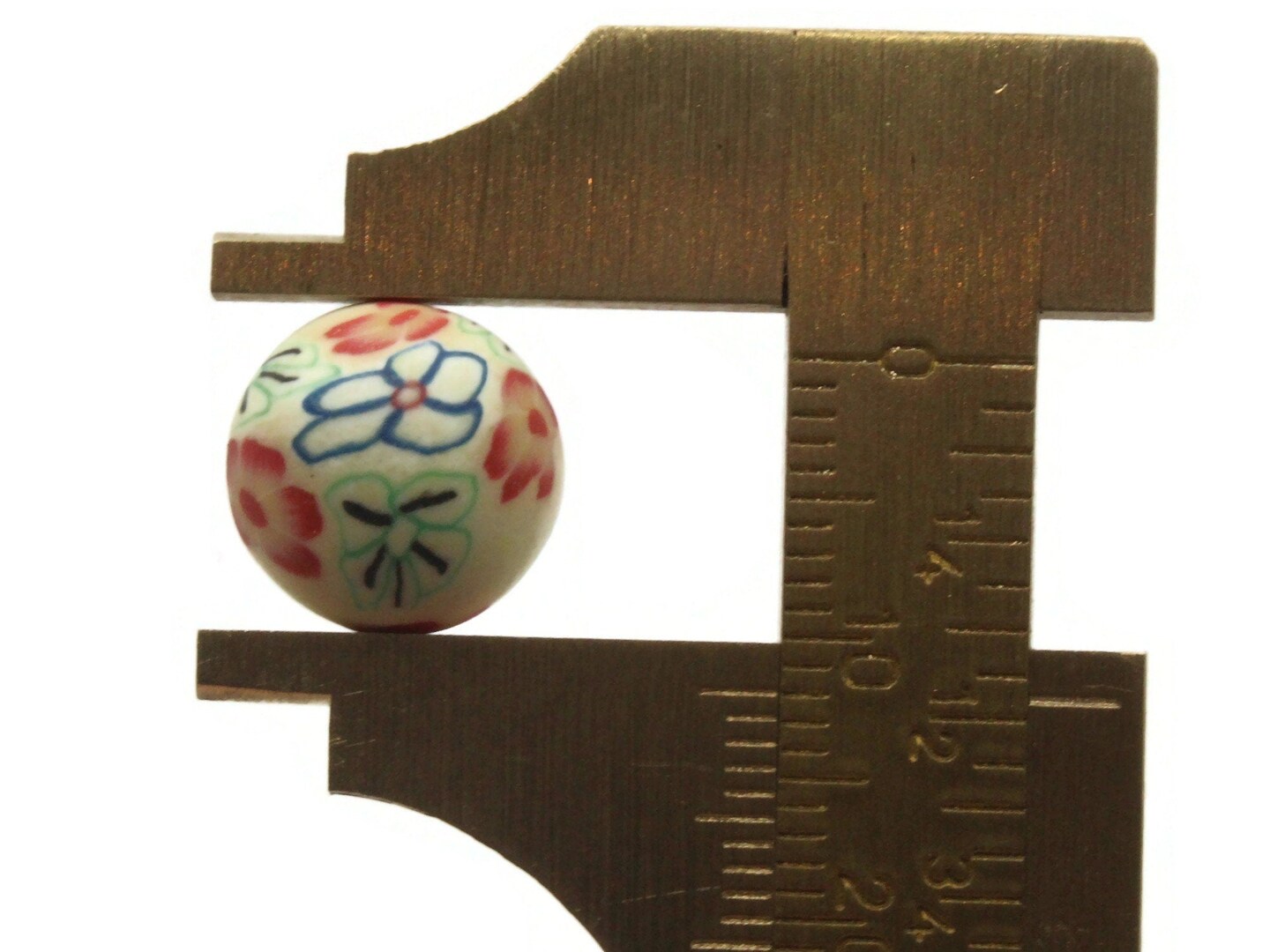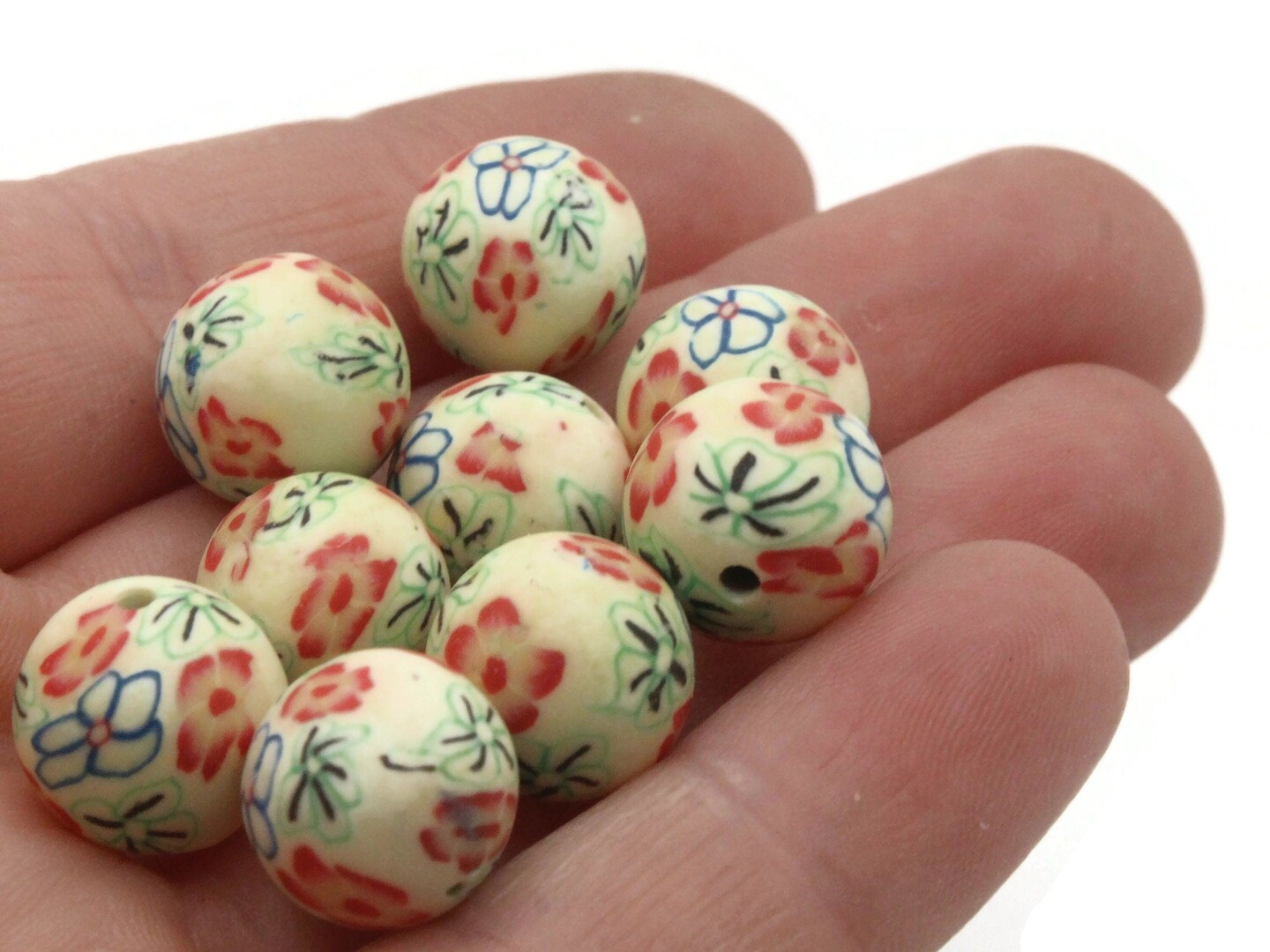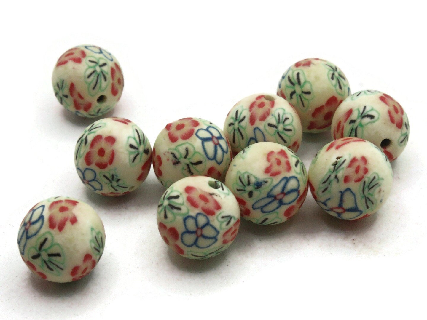 10 12mm Yellow Red and Green Polymer Clay Round Floral Beads
