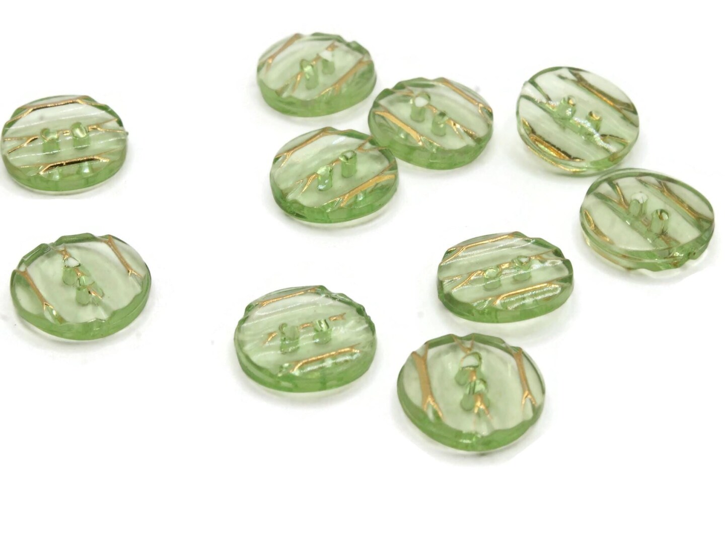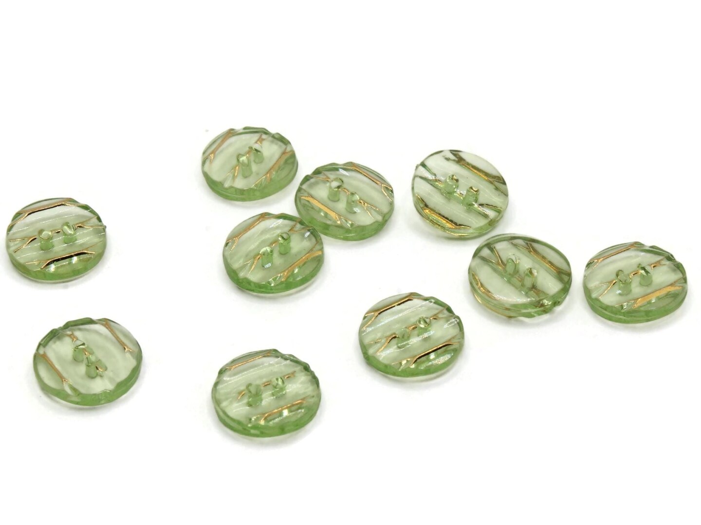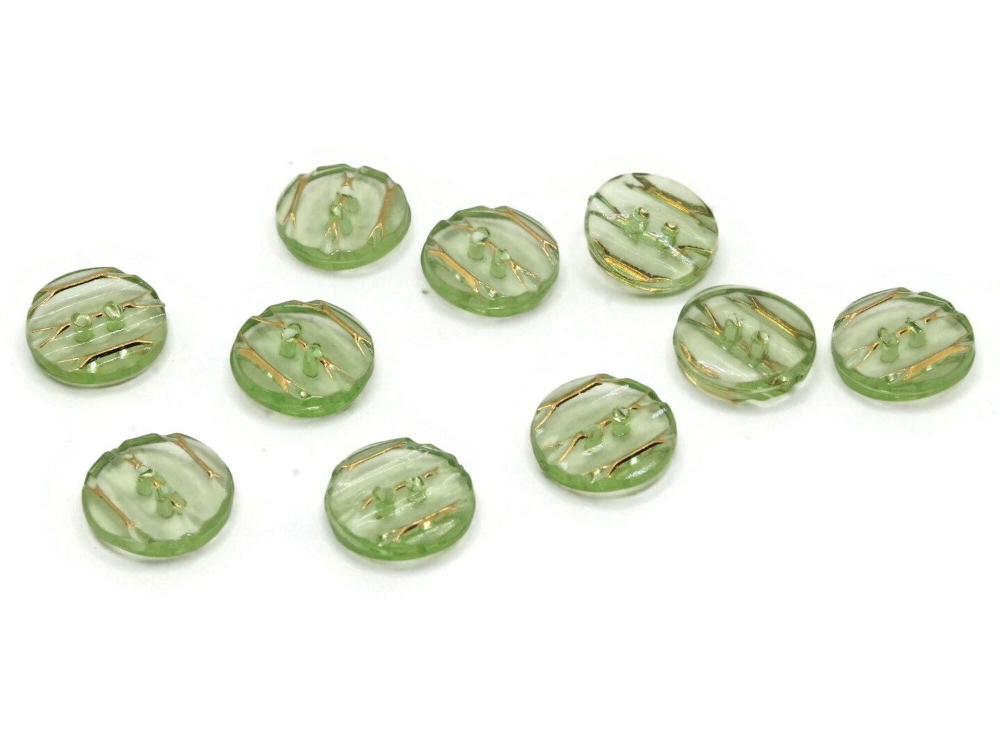 10 13mm Green Plastic Two Hole Buttons with Gold Stripes