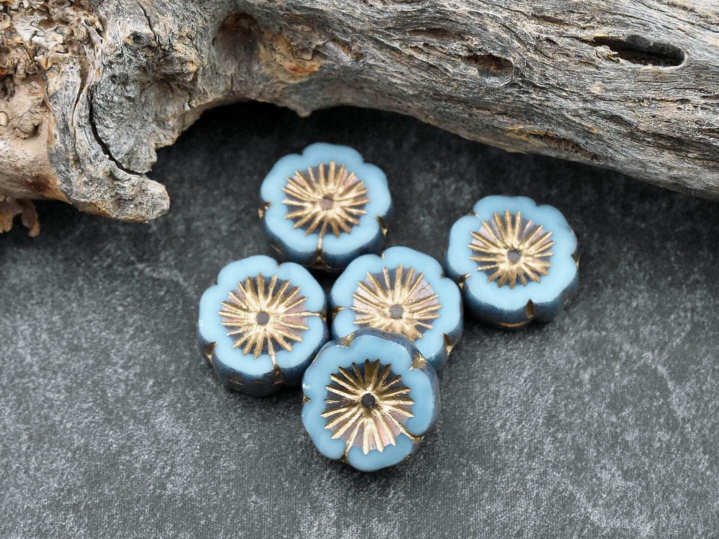 *10* 14mm Bronze & Gold Washed Sky Blue Table Cut Hawaiian Flower Beads