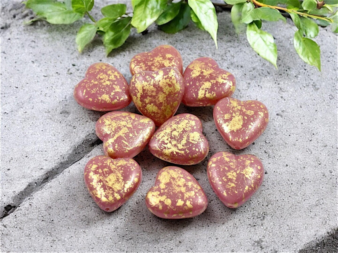 *10* 14mm Gold Splattered Mauve Pink Heart Beads
