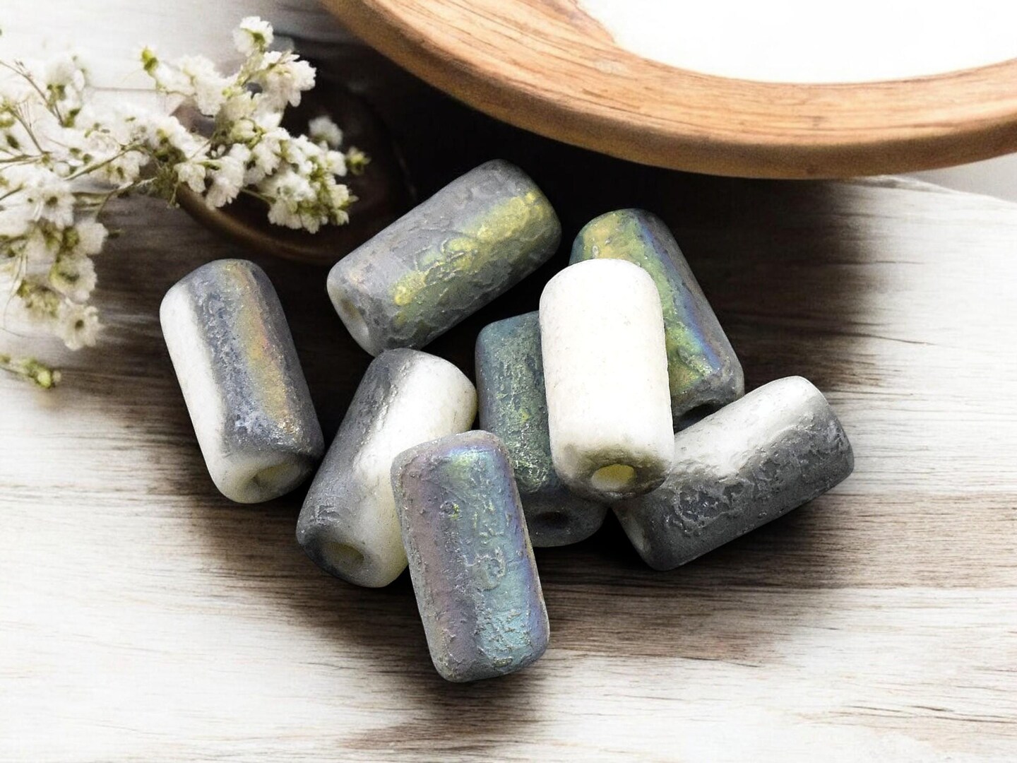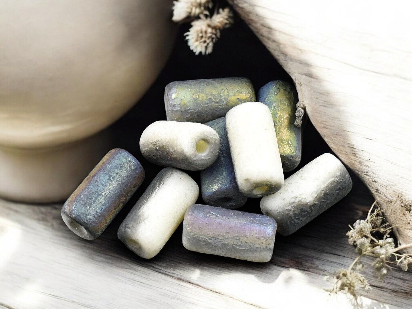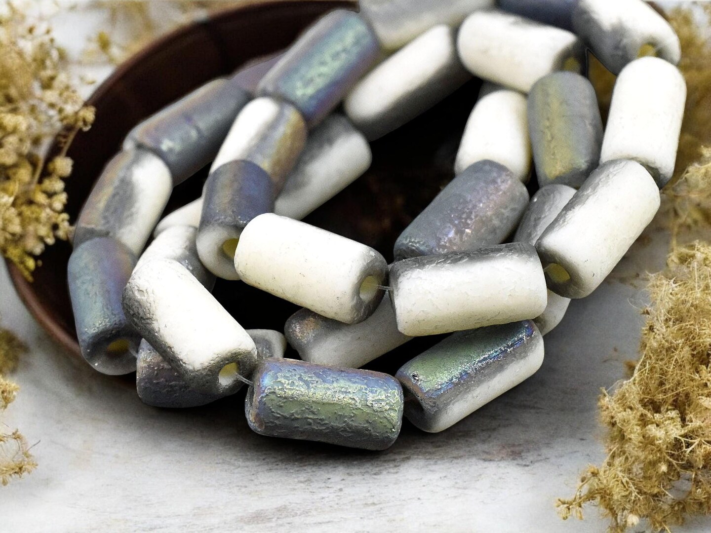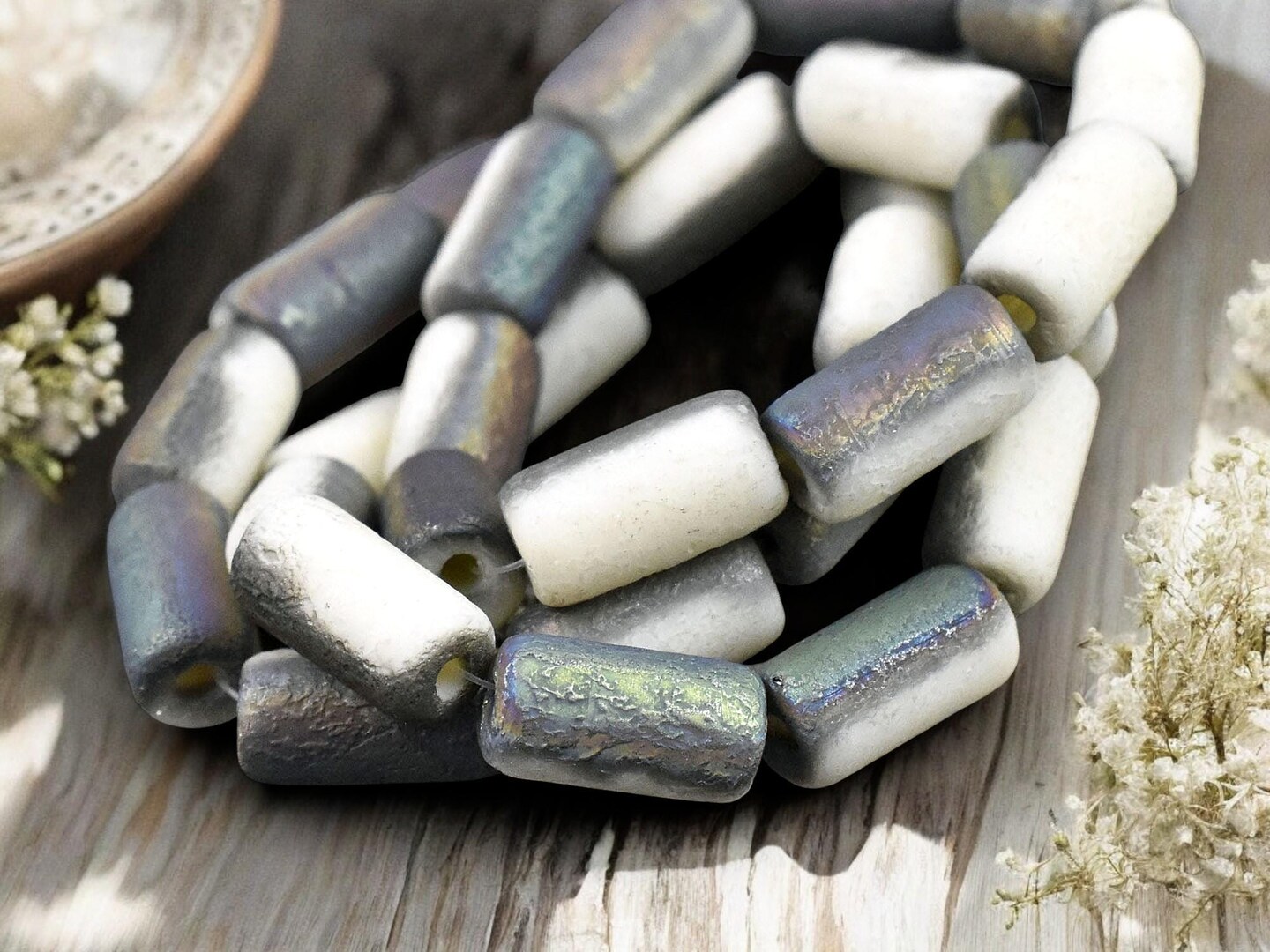 *10* 14x7mm Etched Bone White AB Large Hole Tube Beads