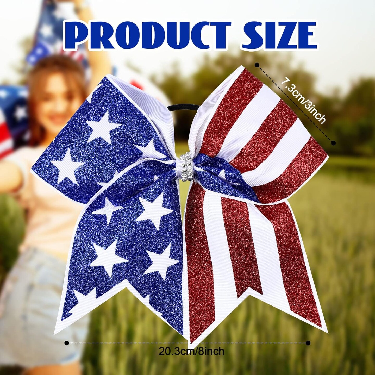 10 Pcs 4th of July Glitter Cheer Hair Bows 8'' Patriotic Cheerleader Red White Blue America Flag Hair Bow with Elastic Ponytail Holder Independence Day Accessory for Kids