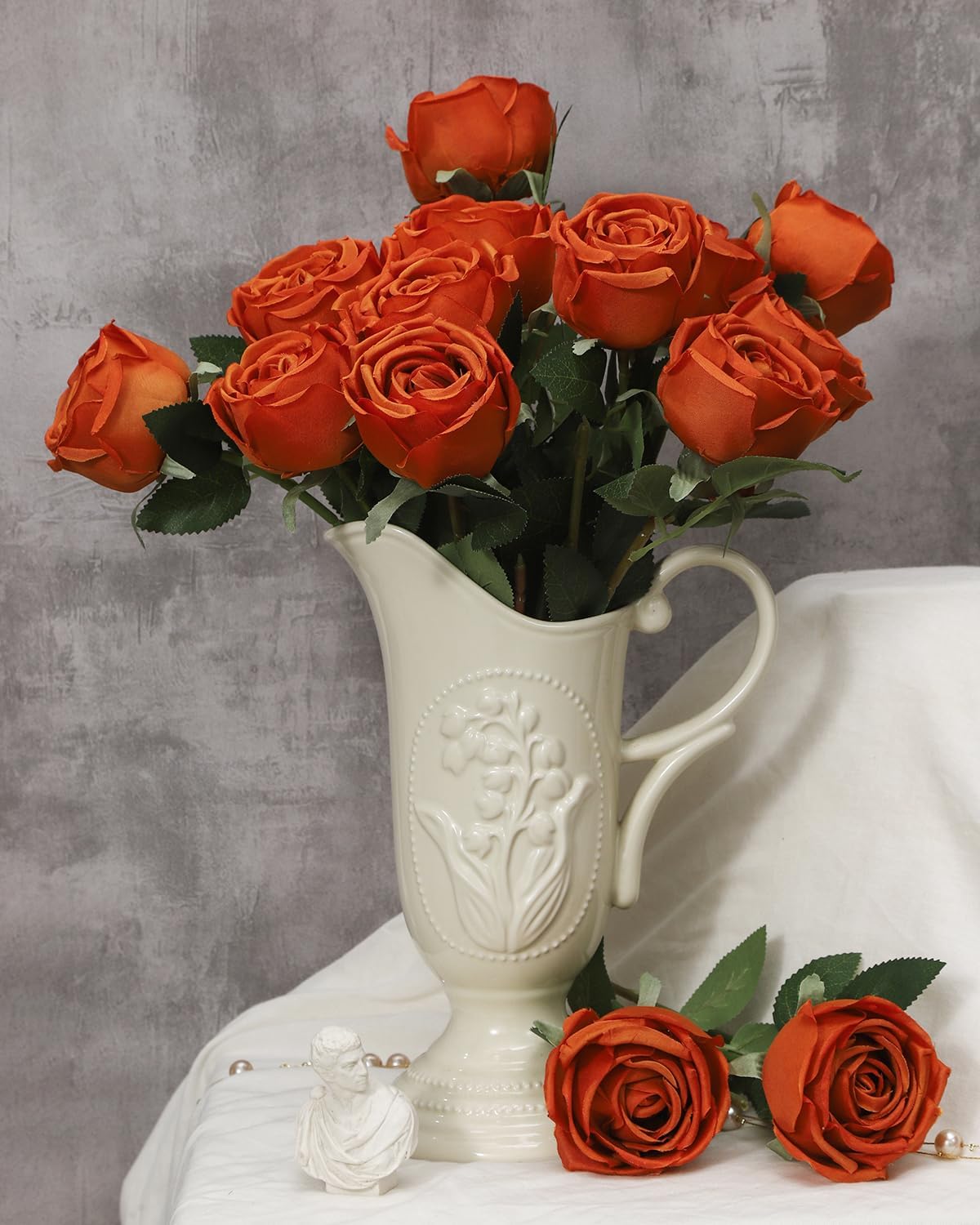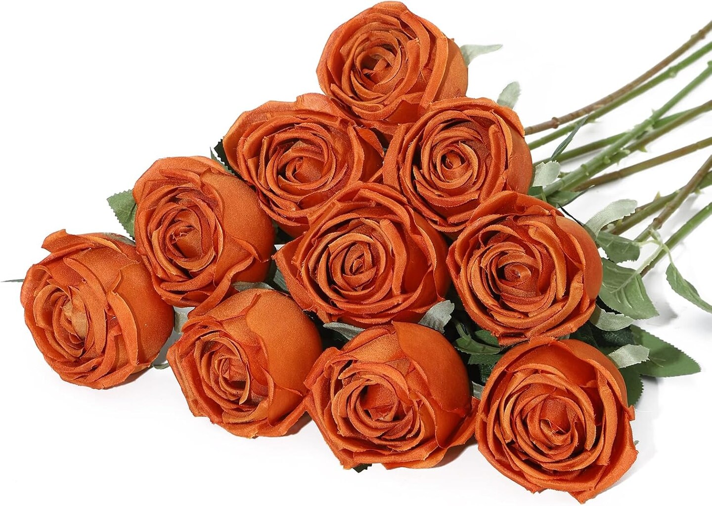 10 Pcs Artificial Silk Rose Flowers with Long Stems(Burnt Orange)
