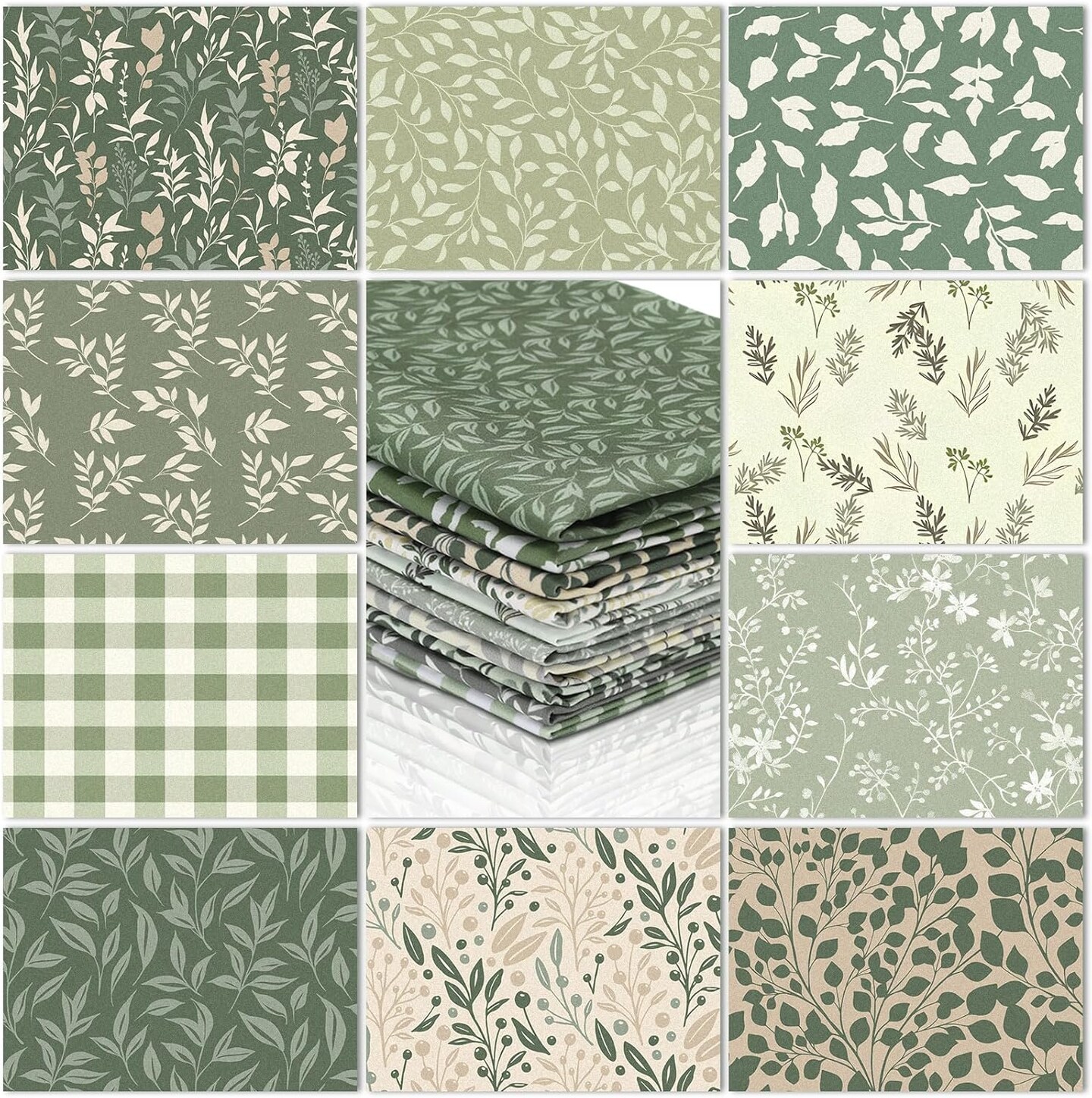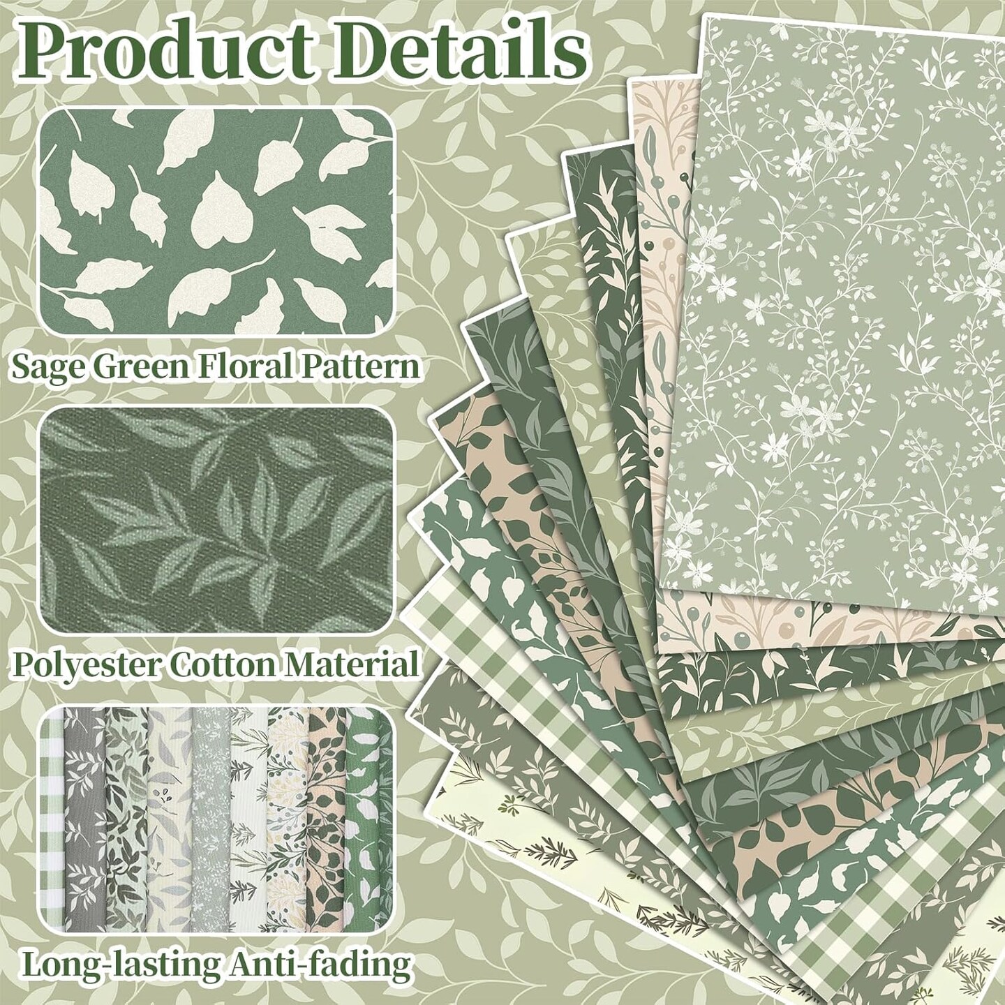 10 Pcs Sage Green Floral Quilting Fabric - 18 x 22 Inch